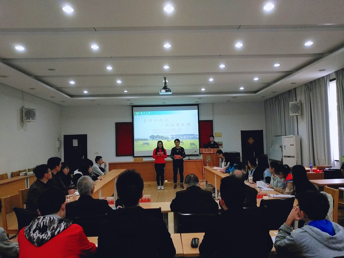 10月18日上午,我院动科1602班“喜迎十九大,共话畜牧情” 主题班团活动在立华报告厅正式拉开帷幕。此次活动特别邀请了校关工委、办公室主任刘方云老师、院关工委的赵万里、朱吉勤、王翌明、经荣斌、罗方妮等5位老同志以及院党委副书记陈立永老师。动科1602的五位同学为老师们献上一场收获满满的暑期社会实践报告。