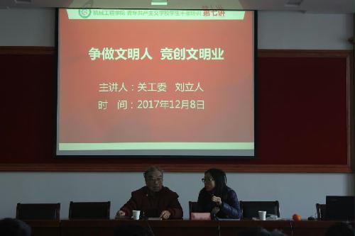 12月8日下午,我院在力行楼401报告厅召开了“争做文明人,竞创文明业”的学生干部培训班第七讲。关工委的刘立人教授受邀出席了此次培训会,院团委副书记、2017级辅导员徐佳老师主持了本次培训会。在培训会上,刘教授首先围绕了文明的定义,逐层剖析,层层递进地讲述了文明的内涵;接着他提到了文明的历史意义、现代意义,同时结合了生动而贴切的例子来说明文明的重要性;最后刘教授向同学们强调了无论是古今中外,文明应该一直放在心中并且从细节渗透到日常生活中。经过了此次培训会,同学们将更好地理解如何成为一个文明人,知道了如何从日常小事做起,改正自己身上的一些坏习惯,向真正的文明靠拢,成为新时代文明的大学生。