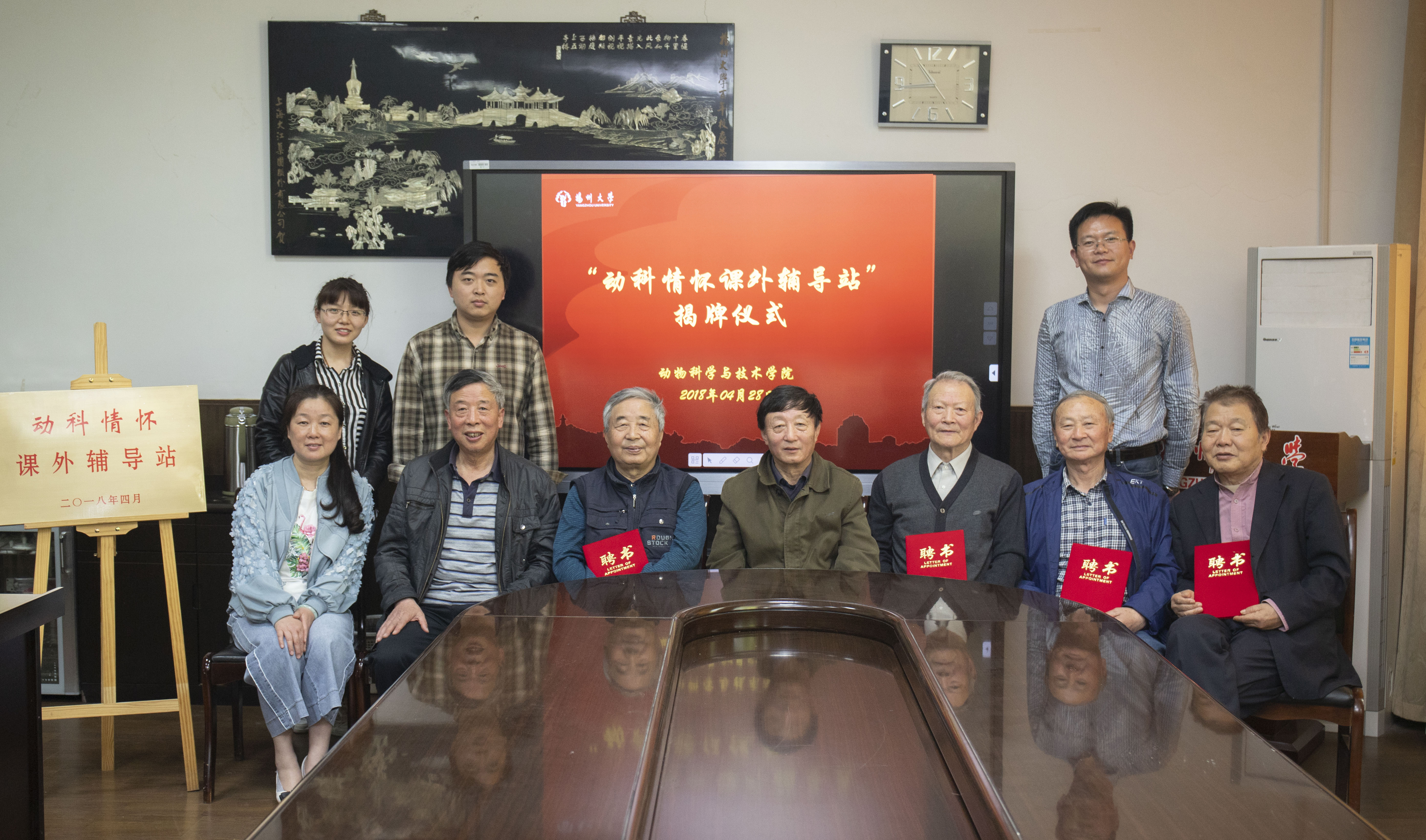 仪式上,院团委副书记任扬宣读关于成立学院关工委“动科情怀课外辅导站”的制度文件;聘任梁隆圣、赵万里、朱吉勤、张牧、王翌明、经荣斌等六名老同志为“专业成长辅导员”,聘任罗方妮为“心理健康辅导员”。