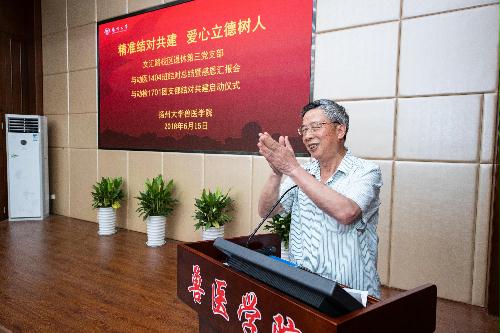 在完成签约后,校关工委办公室刘方云主任发表了热情洋溢的讲话,对退休第三支部与动医1404团支部结对共建的成果表示充分肯定,对交接仪式的顺利举行表示祝贺,并对新结对的两支部提出“多走动,常互动,才能收获感动”的建议。最后,学院党委书记蔡丽娅代表学院对关工委老同志们在我院人才培养工作中给予的支持和指导表示衷心的感谢,并表态今后我院的关心下一代工作要继续强化特色,以实效促创新,推动院关工委工作再上新台阶!
