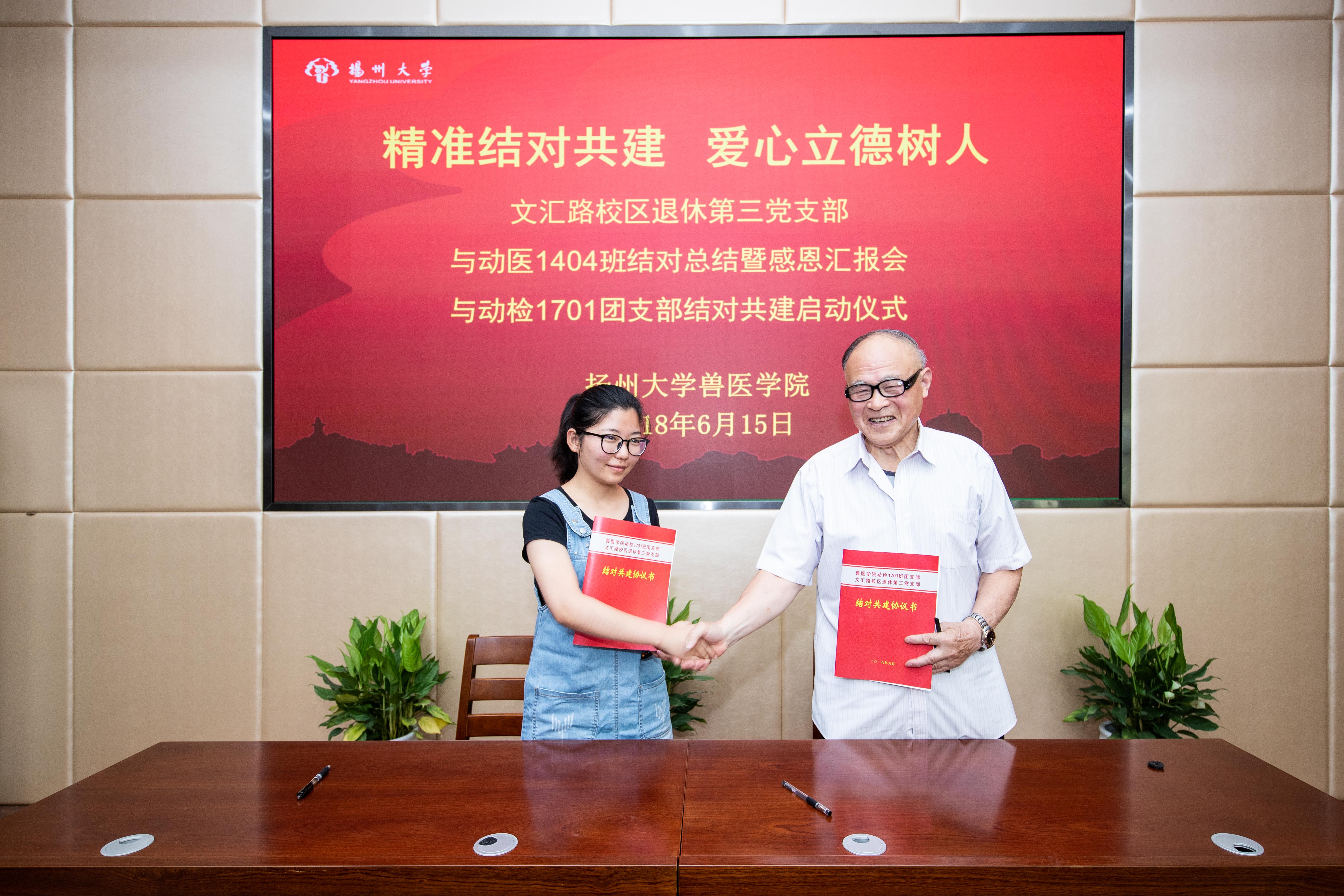 为了延续“老少共建、党团共建”这种传统,巩固既有成果,进一步发挥老同志在指导、引领青年大学生的健康成长、成才方面的优势,将共建的接力棒传递下去,退休三支部与动检1701团支部在经过事先友好协商、双方情况介绍的基础上正式签约结对共建,动检1701团支书朱鑫蓉代表团支部发言表态,表示将带领班级所有团员再接再厉,延续动医1404团支部与退休三支部的良好共建传统,争取取得更好的成绩。