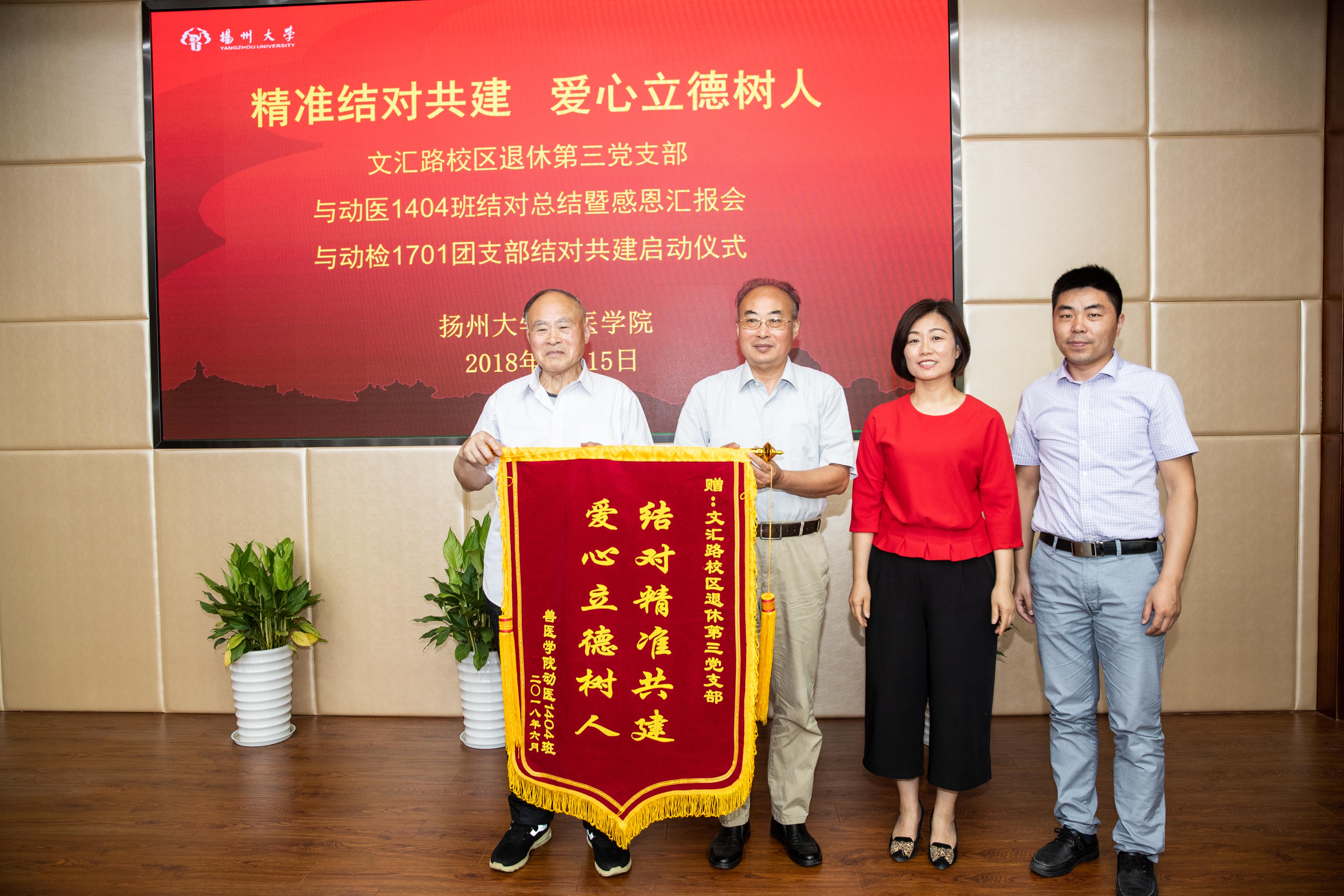 活动伊始,动医1404班班主任李启波分别从思想引领、学习指导及生活关怀等方面汇报了老党员们给予的帮助与支持以及结对共建以来所取得的多项成果,一张张图片、一串串数字都印证着老党员们的付出以及同学们的努力。动医1404班学生代表姜泊宇、韦梅分别分享了在老党员们的关心关爱下自己的成长之路,其中饱含着对老党员们的感激之情。退休三支部钱忠南书记在总结汇报中深情回顾了双方结对共建以来的多个场景和感受,老党员代表陶正松老师语重心长地表达了惜别之情,并对毕业生们申请寄语,希望同学们毕业后能常回母校看看。最后班主任李启波老师代表班级向退休第三党支部赠送“结对精准共建,爱心立德树人”锦旗。