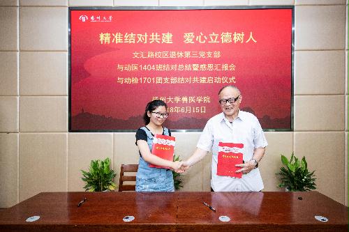 交接仪式结束后,与会领导、文汇校区退休三支部的老党员们分别与动医1404、动检1701团支部在兽医大楼前的草坪上合影留念。