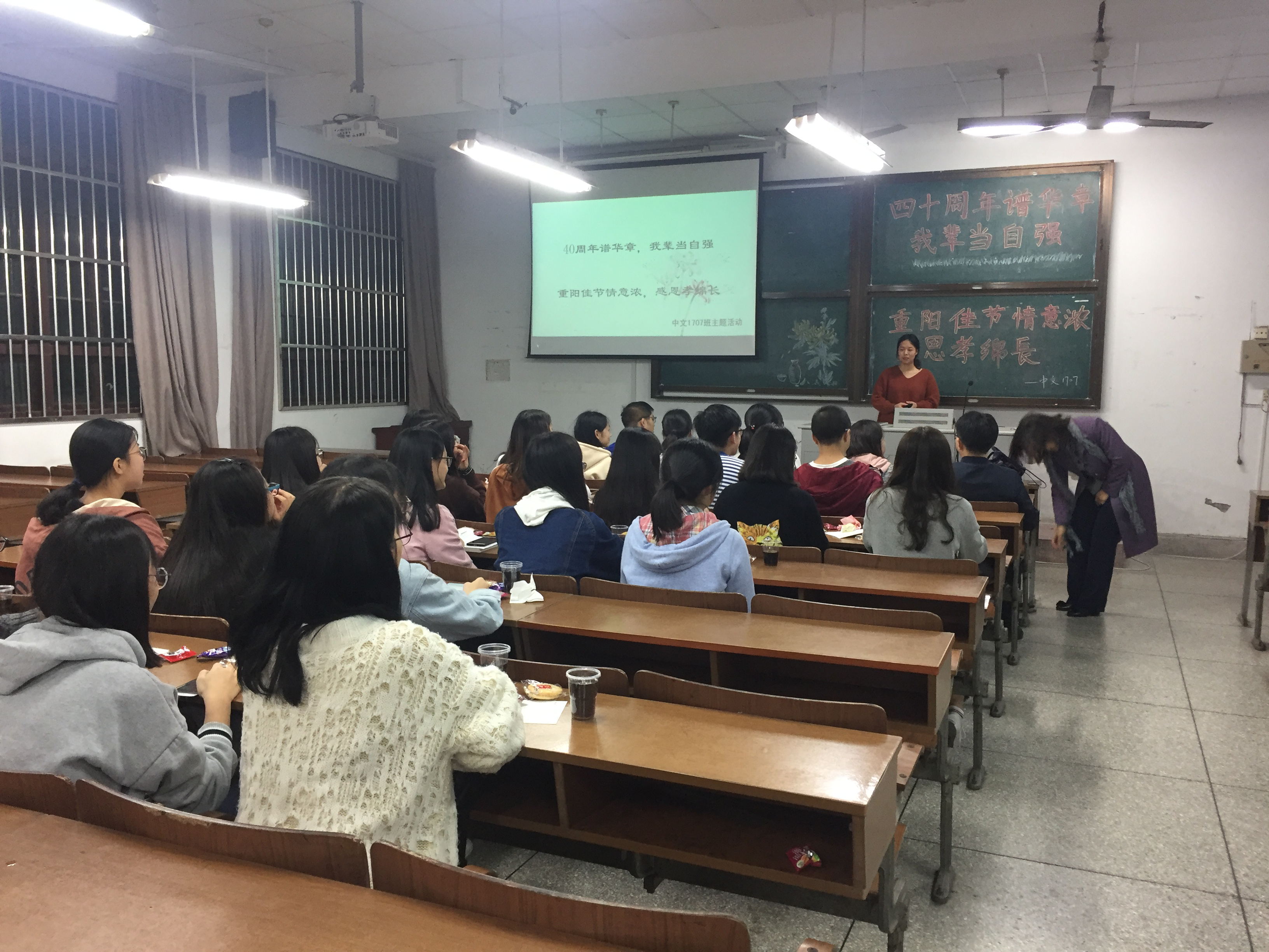 10月17日,文学院1708班、1803班在56号楼,共同策划开展了主题为“改革开放福音响,重阳佳节情绵长”的主题班团活动,文学院退休教师吴周文教授应邀参加本次活动,并发表讲话。