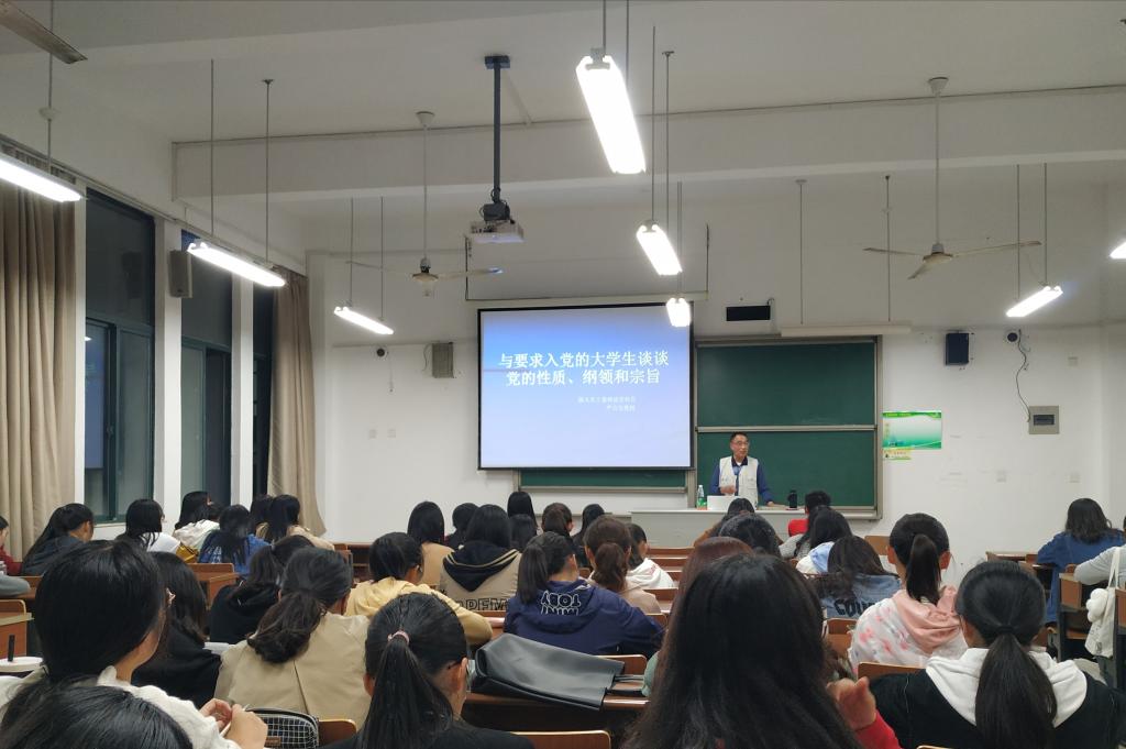活动伊始,关工委严公宝教授为同学们做了精彩的讲座。严教授结合自身经历讲述了他入党的历程,并从党的性质、党的纲领、党的宗旨等方面为我们详细地介绍了中国共产党。严教授为我们解读了党员应该履行的义务及大学生应该树立的科学价值观。严教授的发言不仅生动形象,而且富有极强的感召力和鼓舞力,他对各个革命人物的剖析十分深刻,使这些党员先驱们的形象更加鲜明起来。严教授呼吁广大大学生学好知识,学好马克思主义和习近平新时代中国特色社会主义思想为共产党注入新鲜的血液,为实现共产主义努力奋斗。
