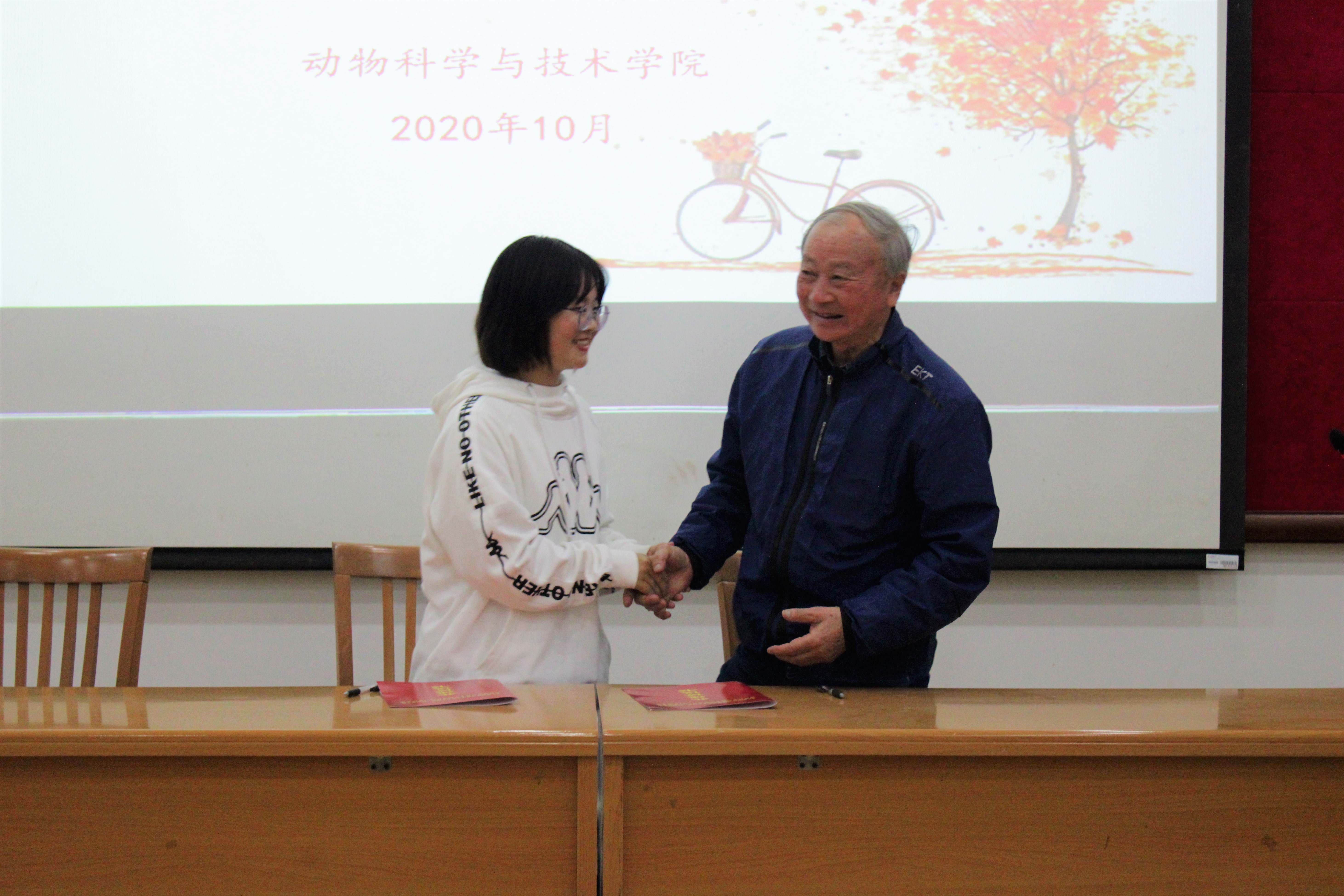 在共建仪式上,文汇路校区离退休党总支直属第一特别党小组书记王翌明老师与动科2001班团支书华而实代表双方签订共建协议书,正式地将关工委对接工作接力棒从动科1701班传到动科2001班手上。
