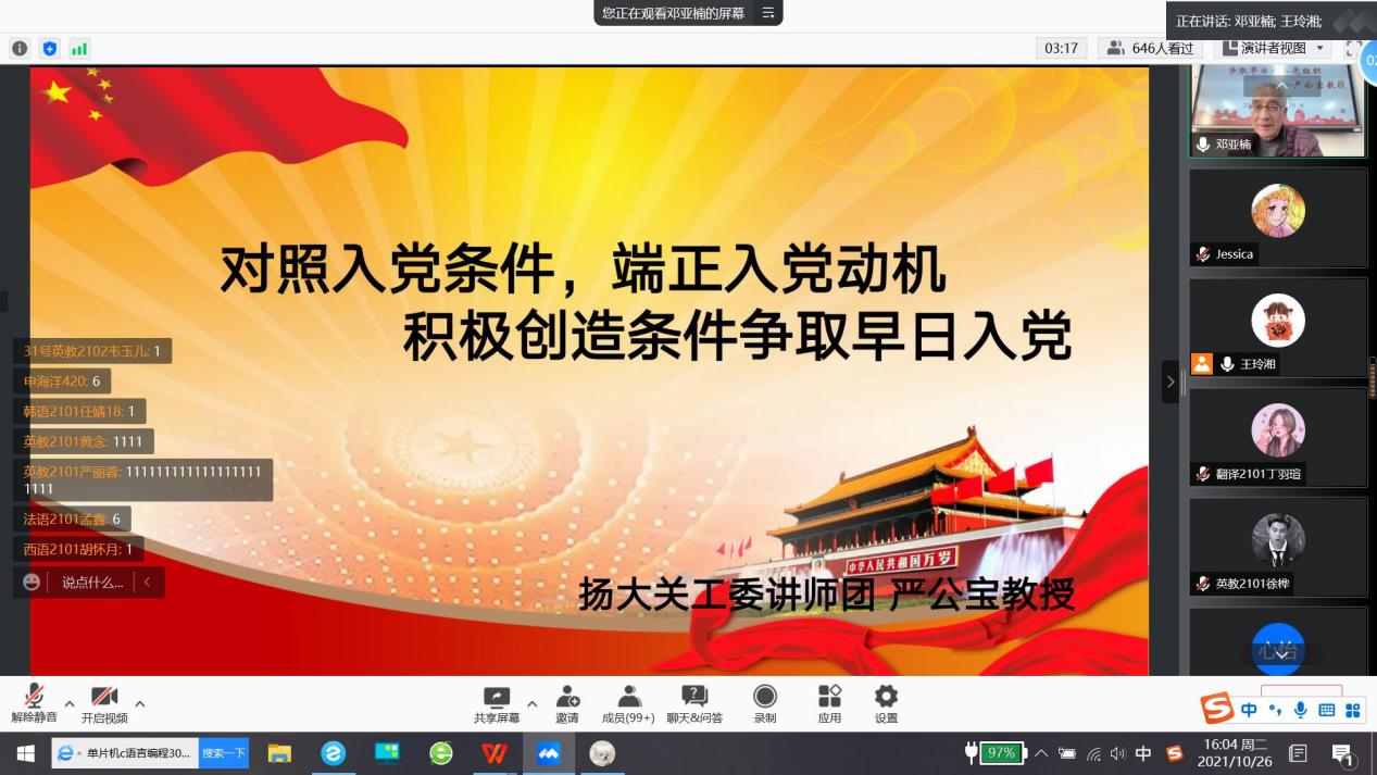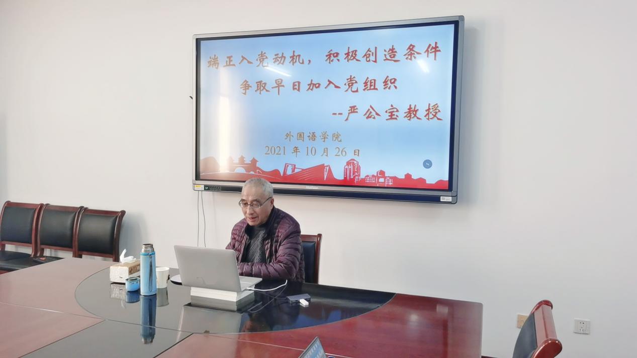 10月26日下午,外国语学院于线上举行新生入学教育活动,特邀校关工委理论讲师团成员严公宝教授通过“腾讯会议”的云平台向2021级本科生做“对照入党条件,端正入党动机——积极创造条件争取早日入党”专题讲座,帮助广大新生坚定理想信念、明确入党初心。院辅导员王玲湘主持本次培训会议。