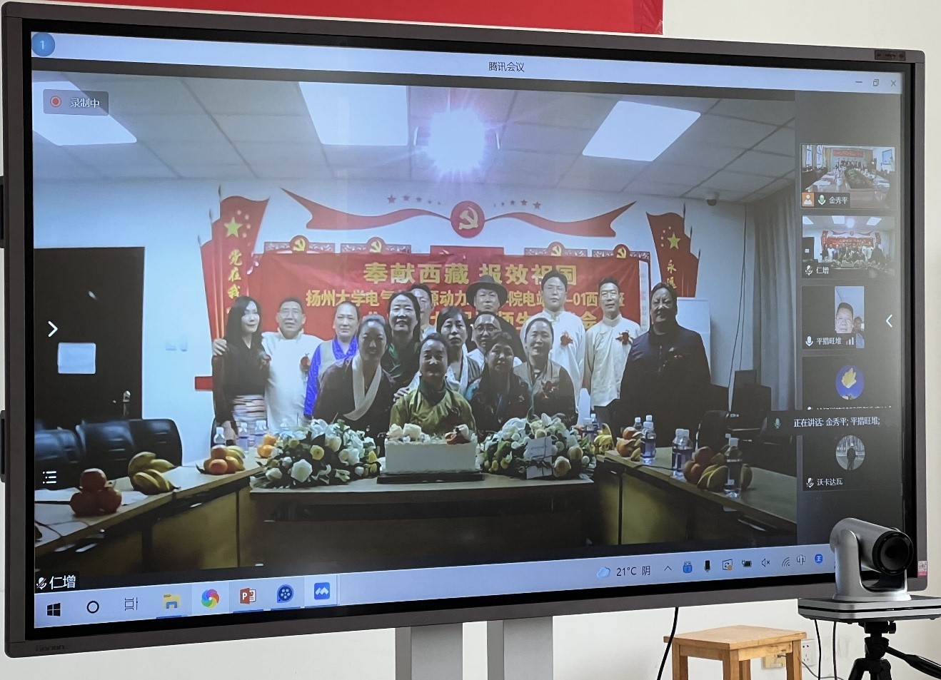 在观看学院为西藏班校友特别制作的《美好的记忆短视频》后,校友代表普琼、詹先兰、平措先后做了发言,他们深情回顾了32年前从西藏来扬的求学之路,十分感谢母校的教育培养以及老师们的谆谆教诲,并向母校和老师们汇报了各自所取得的主要成绩。电站9001(西藏)班班主任俞斌作为教师代表讲话,他以三个西藏班学生的求学故事将校友们的思绪拉到了在母校的美好岁月。尽管俞老师已经年逾八十,但依旧能够亲切地叫出每位学生的姓名。在高度赞赏校友们近三十年来所取得的骄人业绩后,他希望校友们在艰苦的自然环境下更应珍重身体,为在新时代奉献西藏、报效祖国谱写新篇章。