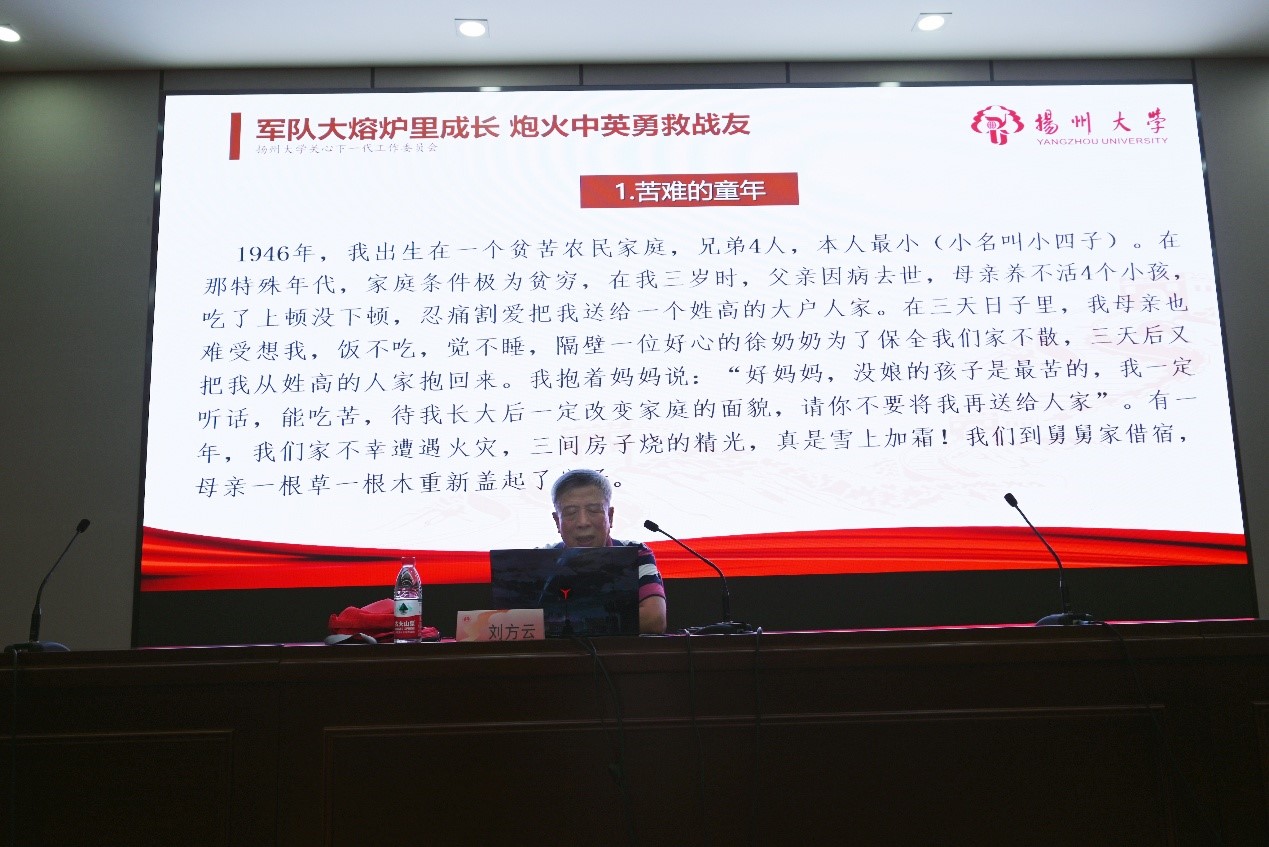 刘老师从幼年讲起,为新生们展开了一幅辉煌锦绣的人生画卷。饥寒窘迫的苦难童年使他铸就了勤劳节俭的生活态度,母爱的坚韧伟大又让他懂得感恩的举足轻重。刘老师以自身援越抗美、勇救战友经历为例,让同学们深刻领略中国人民解放军的豪迈英勇以及为人民服务的忘我精神。他用在部队义务服务、刻苦学习的奋斗精神号召新时代大学生敢于担当干实事。同学们深深沉浸在那段峥嵘往事中,掌声如雷。