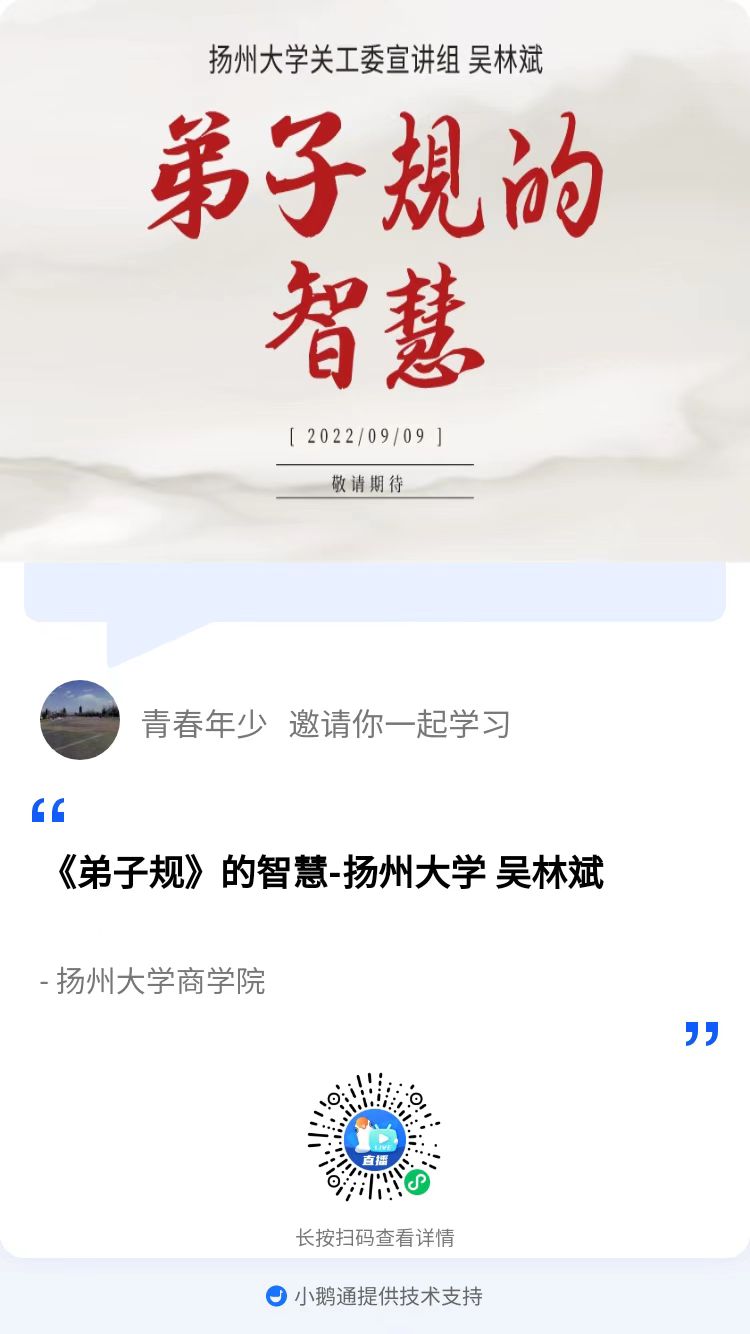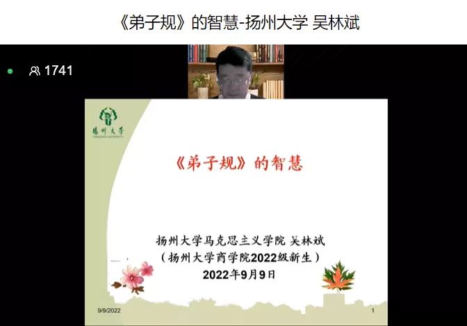 9月9日晚上七点,商学院通过线上直播的方式开展了《弟子规》的智慧专题讲座,扬州大学马克思主义学院吴林斌老师主持讲座,商学院2022级新生参与本次讲座。