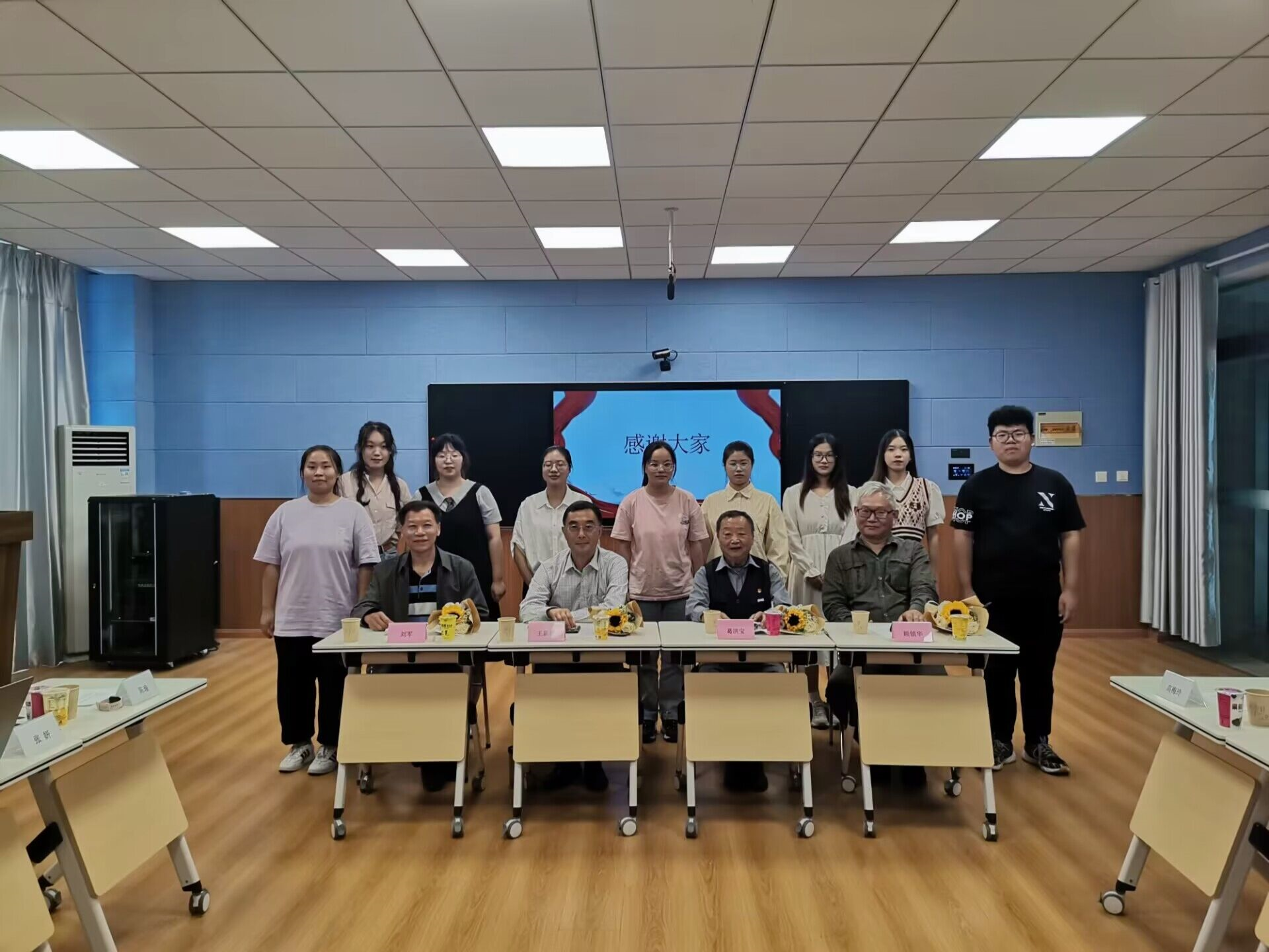 座谈会结束,同学们向参加会议的老同志代表献上鲜花和贺卡,表达深深的谢意,祝老同志国庆、重阳“双节”快乐,师生合影留念。