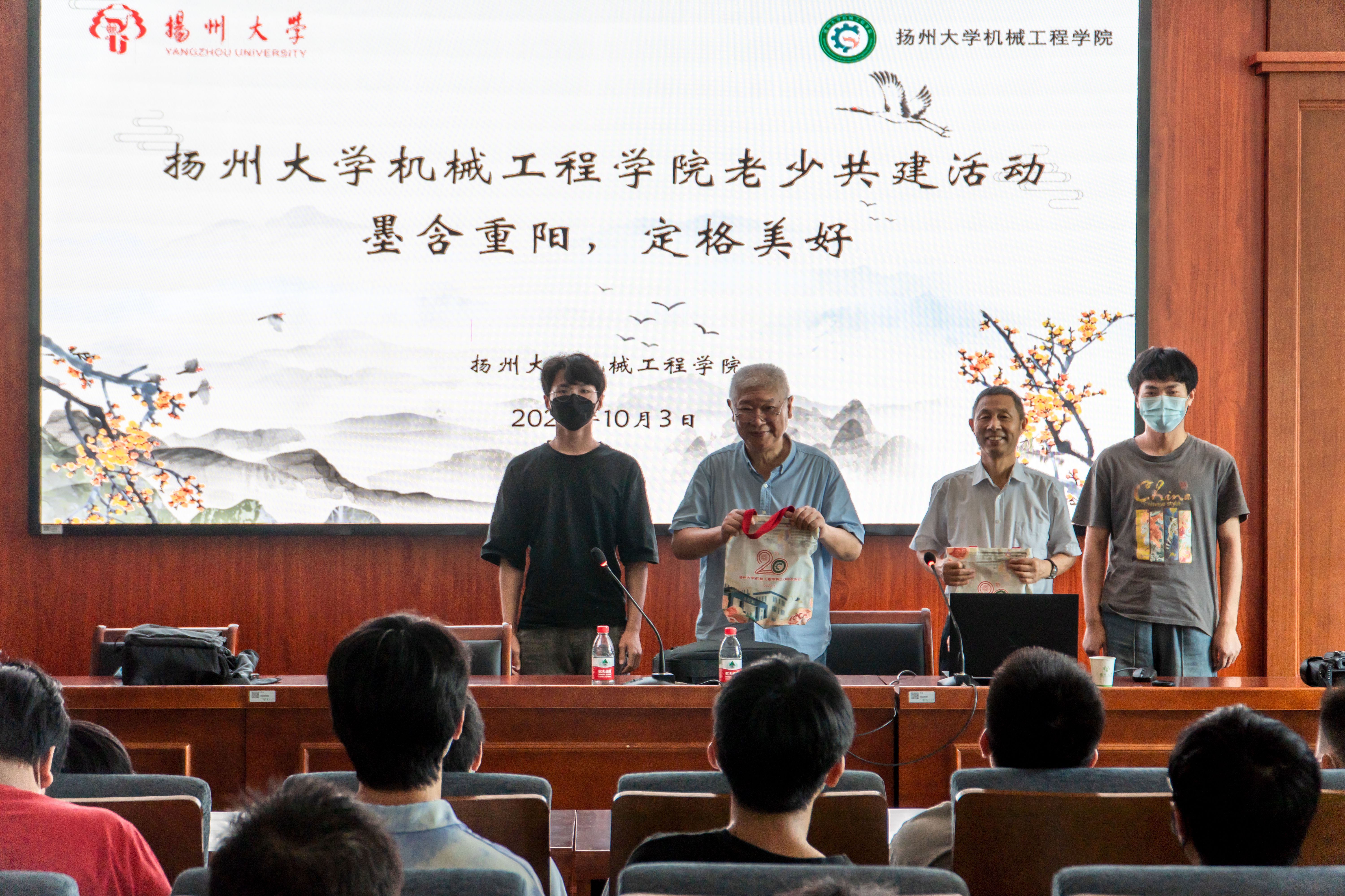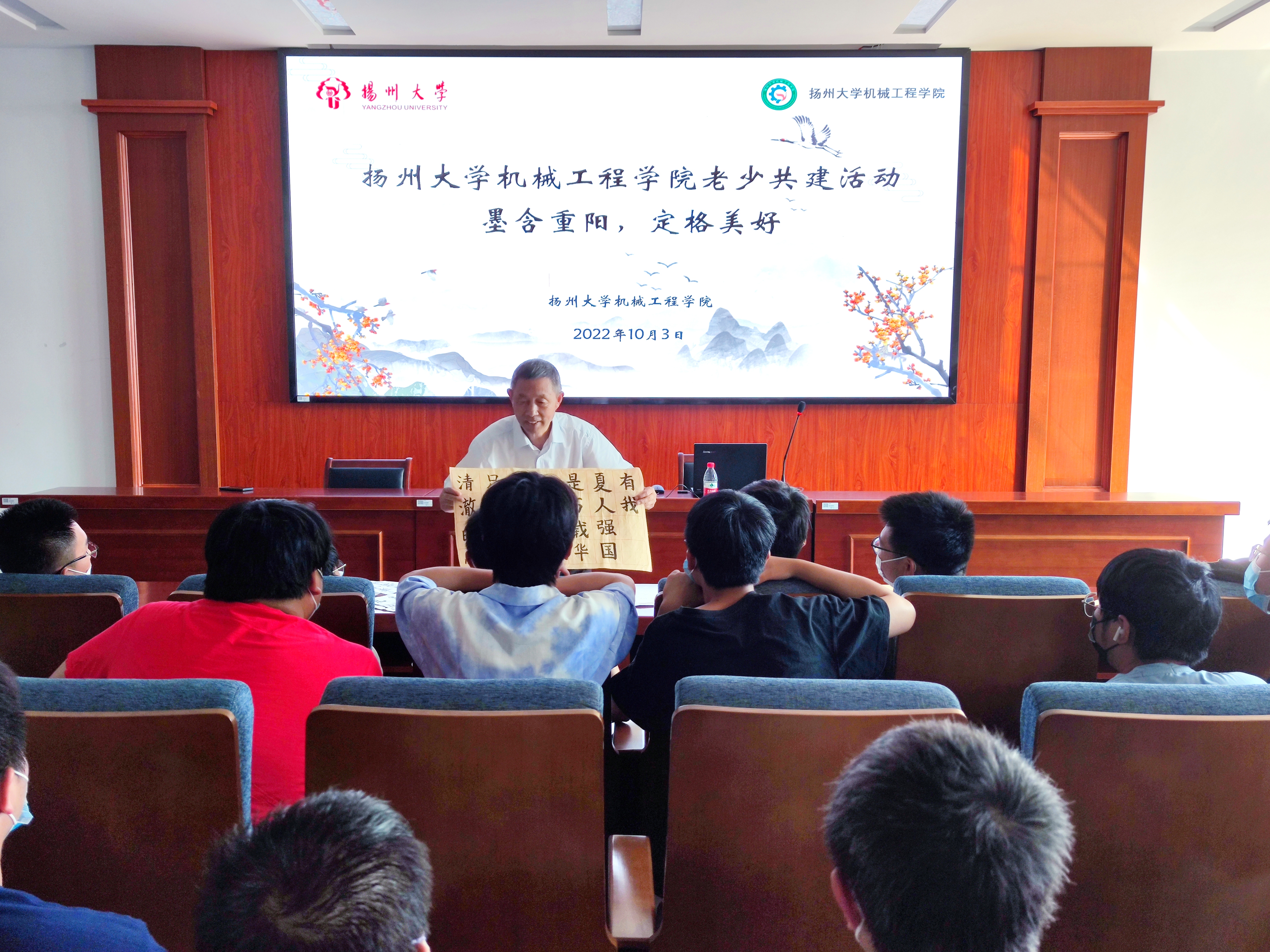 10月3日,机械工程学院于力行楼401报告厅开展“墨含重阳,定格美好”共建班级重阳节活动。机械工程学院邀请江阳路北校区离退休第一党支部书记、校心理健康专家李传伟老师和江阳路北校区总支退休老党员陈伟老师进行讲座,学院团委书记徐香翠主持讲座,院团委副书记汪志国、共建班级机械2103班及其他班级学生代表参加活动。