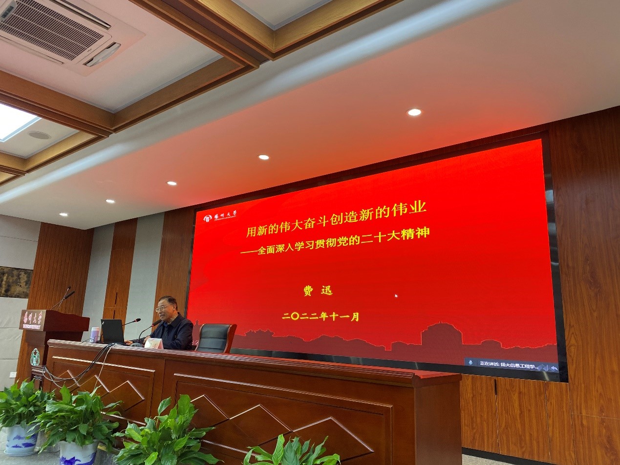 11月13日上午,信息工程学院在学院三楼报告厅开展主题为“用新的伟大奋斗创造新的伟业——学习贯彻党的二十大精神”的讲座。讲座由校关工委讲师团费迅老师主讲,院团委副书记(学工办副主任)方晓敏老师主持。学院发展对象和预备党员参加。