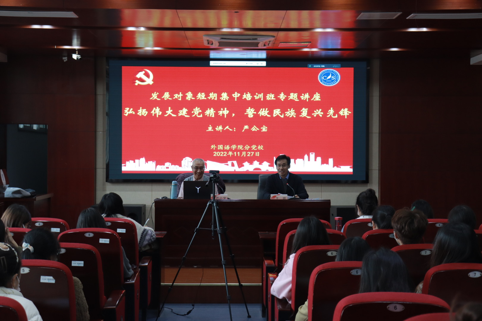 11月27日下午,外国语学院在笃行楼二楼模拟法庭开展发展对象短期集中培训班专题讲座,特邀扬州大学关心下一代工作委员会宣讲团成员严公宝教授做“弘扬伟大建党精神,誓做民族复兴先锋”主题讲座。本次讲座由外国语学院党委副书记王晖主持,采取线上线下相结合的形式开展,学院2022年下半年发展对象参与了此次讲座。