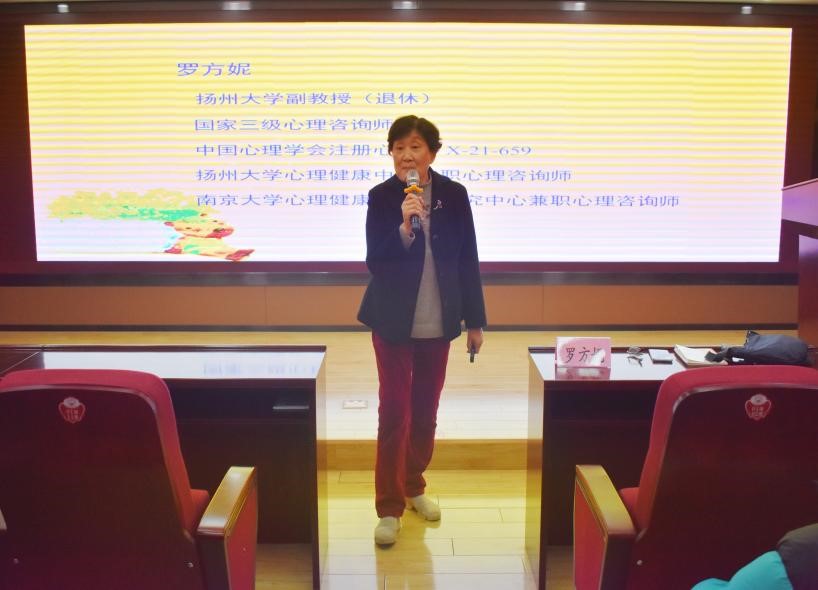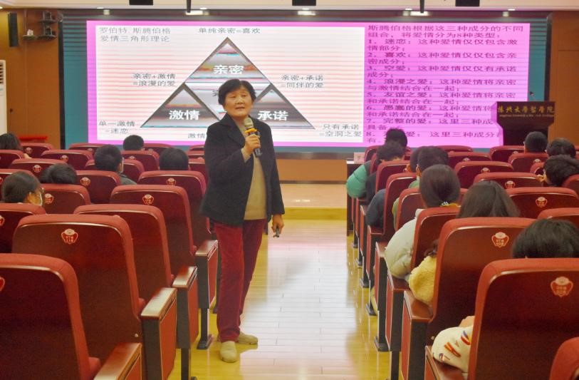 12月6日晚上7点,学院邀请校关工委理论宣讲团罗方妮老师在江阳路北校区5号楼401报告厅举办“恋爱你我它”心理健康讲座。罗方妮老师是国家三级心理咨询师、中国心理学会注册心理师、扬州大学心理健康中心兼职心理咨询师,她从自己的恋爱故事讲起,拉近和同学们之间的距离。
