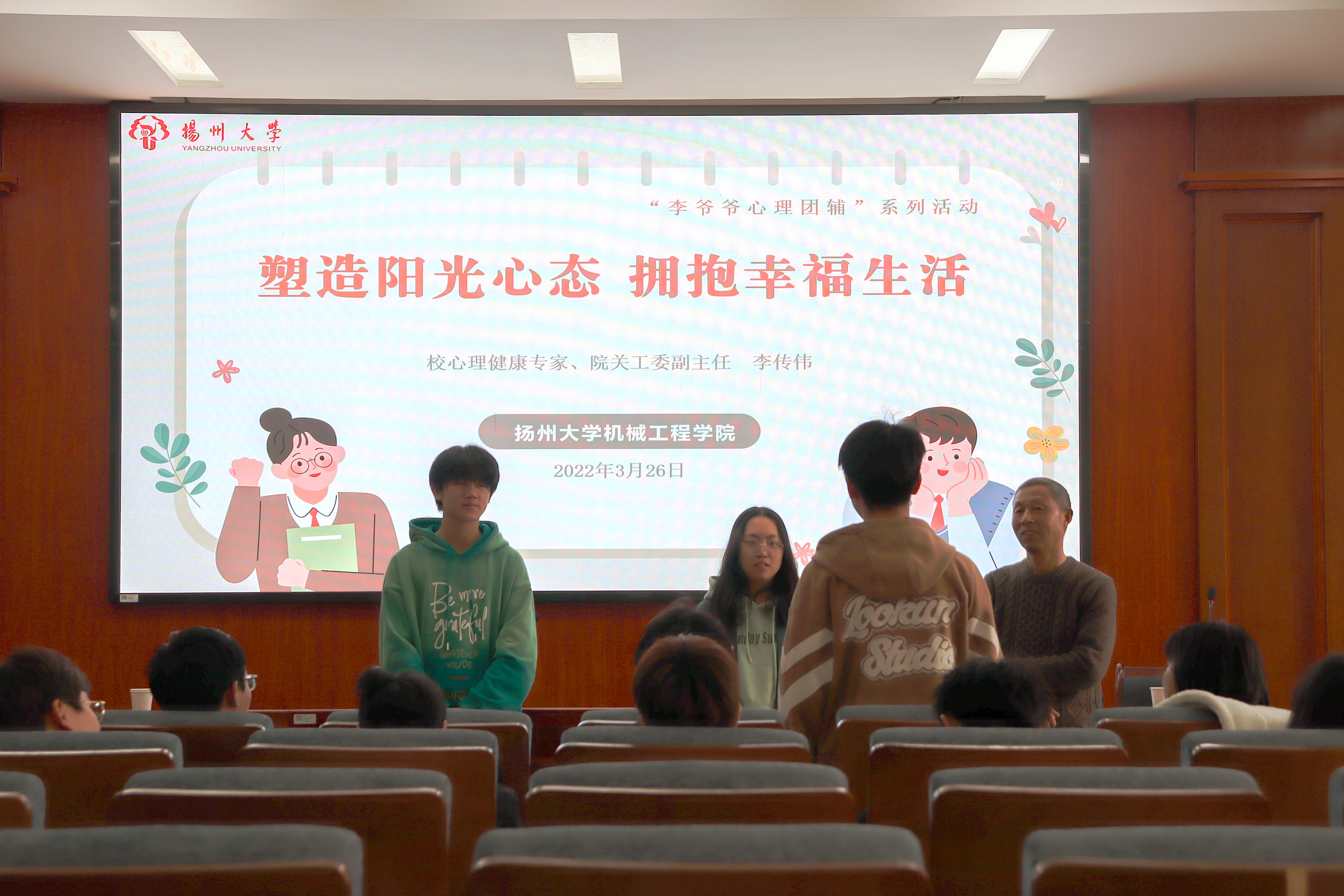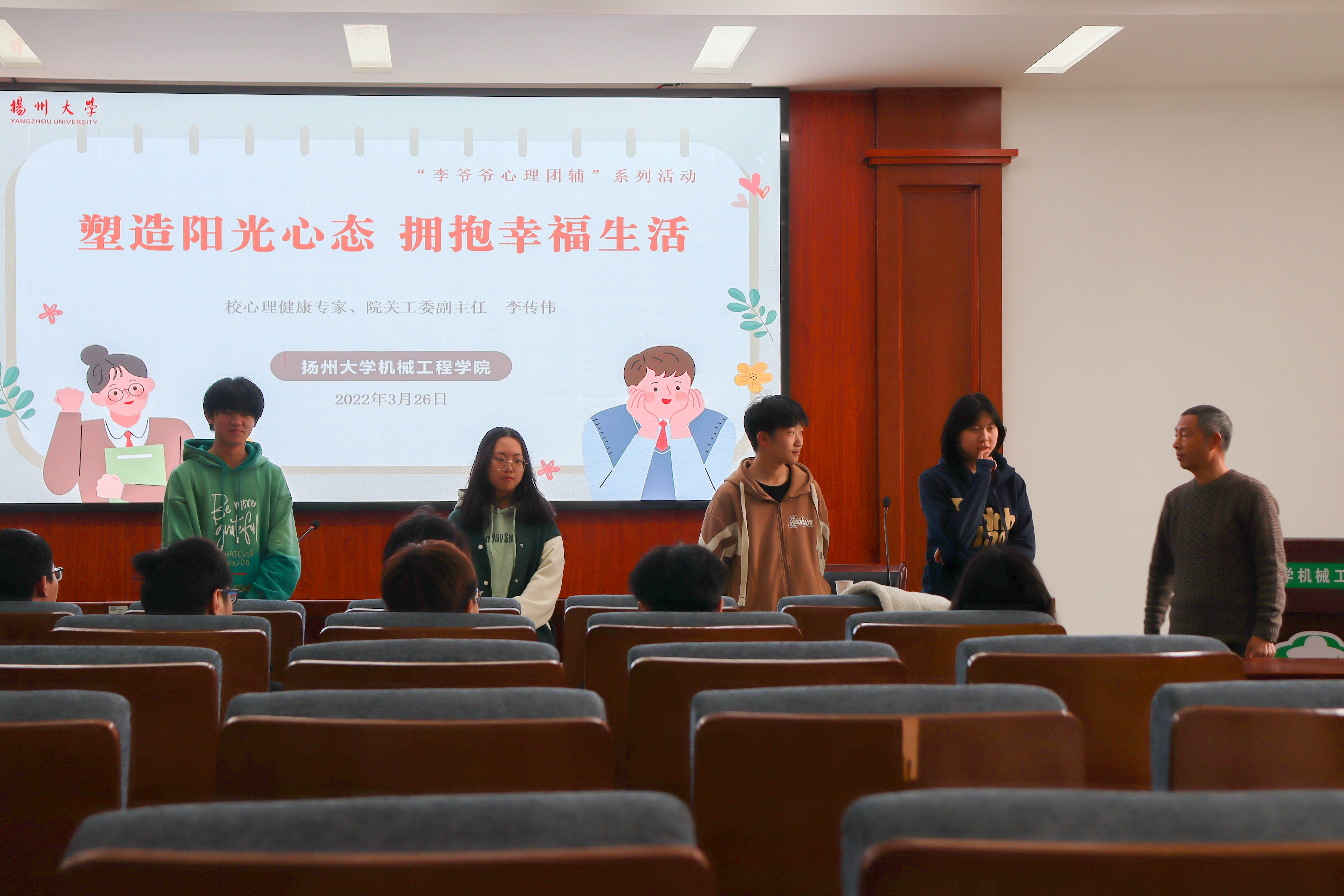 3月26日下午,机械工程学院在力行楼401报告厅举行“塑造阳光心态 拥抱幸福生活”——“李爷爷心理团辅”活动暨心理委员工作会议。校心理健康专家、院关工委副主任李传伟,本科生各班级心理委员,共建班机械2103班学生代表参加活动,辅导员单小伟主持会议。