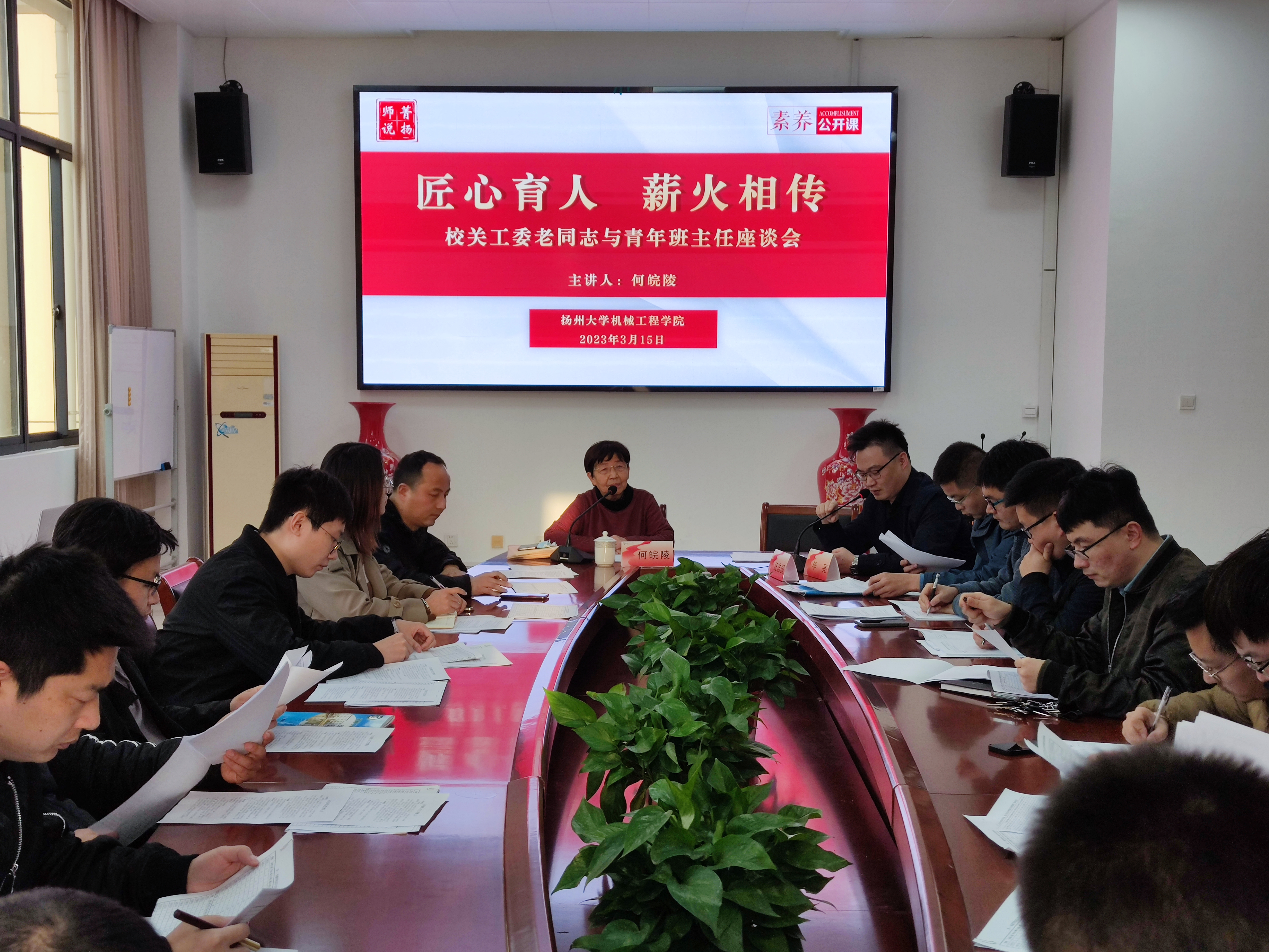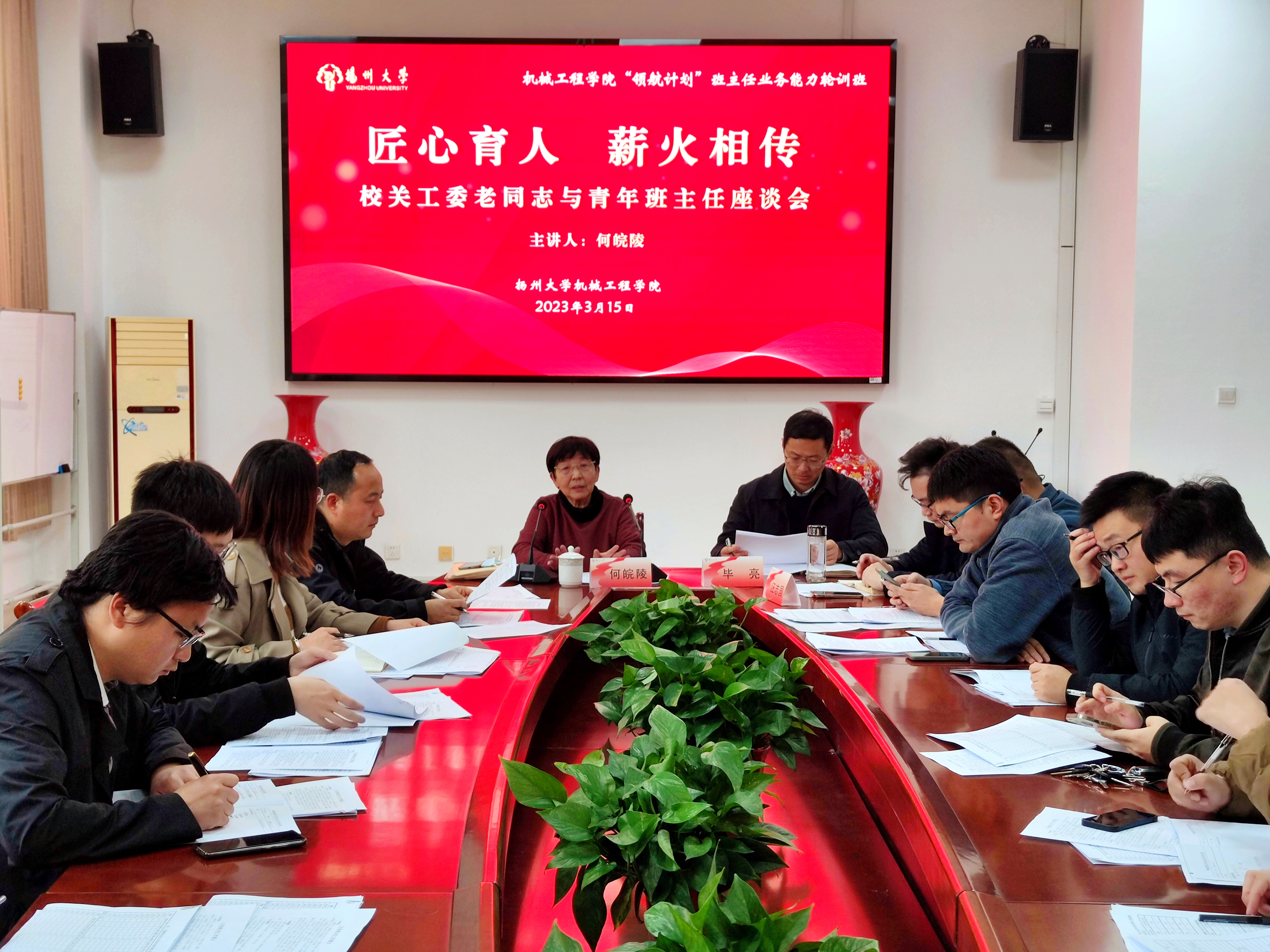 3月16日下午,机械工程学院于力行楼s318会议室召开“匠心育人,薪火相传”校关工委老同志与青年班主任座谈会暨2022-2023学年春学期三月份班主任工作例会。江阳路北校区离退休老同志、原共建班级机械1502班结对老师何皖陵,院党委副书记毕亮,团委副书记汪志国,学院全体辅导员和辅导员参加会议。会议由汪志国老师主持。