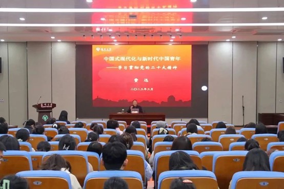 费教授呼吁各位青年担负起推进中国式现代化的历史重任,做“有理想、敢担当、能吃苦、肯奋斗”的新时代好青年。正如二十大报告中所说:“青年强,则国家强。当代中国青年生逢其时,施展才干的舞台无比广阔,实现梦想的前景无比光明。”费教授指出,中国共产党永远是面向青年、面向未来的党,是一个具有“青春特质的党”,这与党的性质与本质是紧密相关的。最后,费教授鼓励同学们成为中国式现代化新青年,以奋斗之力谱写青春华章,为以中国式现代化全面推进中华民族伟大复兴而永久奋斗!