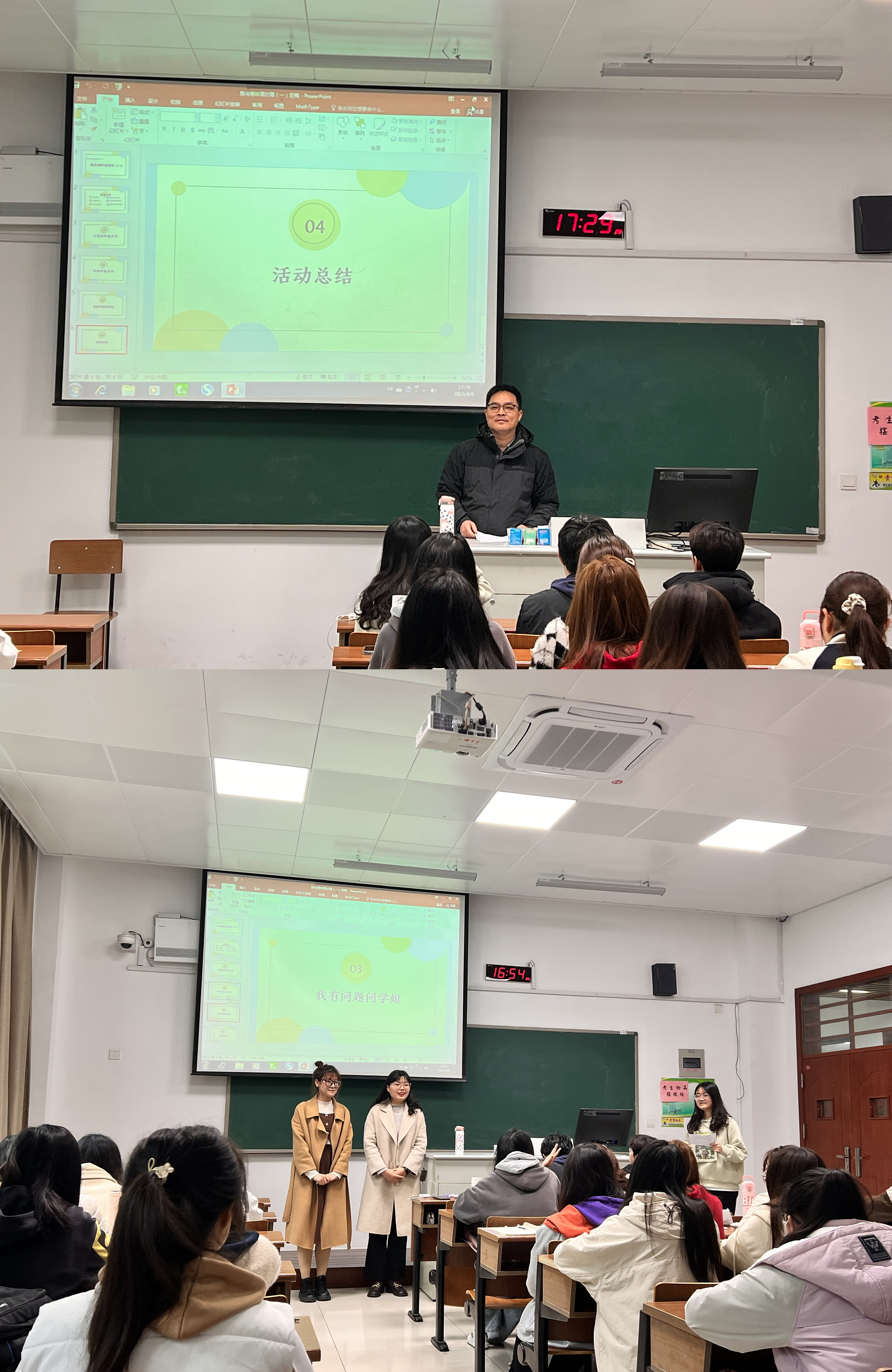 为充分发挥先进典型的示范作用,引导同学们合理规划大学生活,4月6日下午,外国语学院英教2201班在文津楼S210教室召开“我与榜样面对面”经验分享会。分享会邀请到了国家奖学金获得者刘童洁、美德学生奖学金获得者许诺分享自己的学习经历和成长经验。院党委书记、关工委名誉主任居学明,院关工委成员、辅导员邓亚楠,班主任焦丹出席活动。