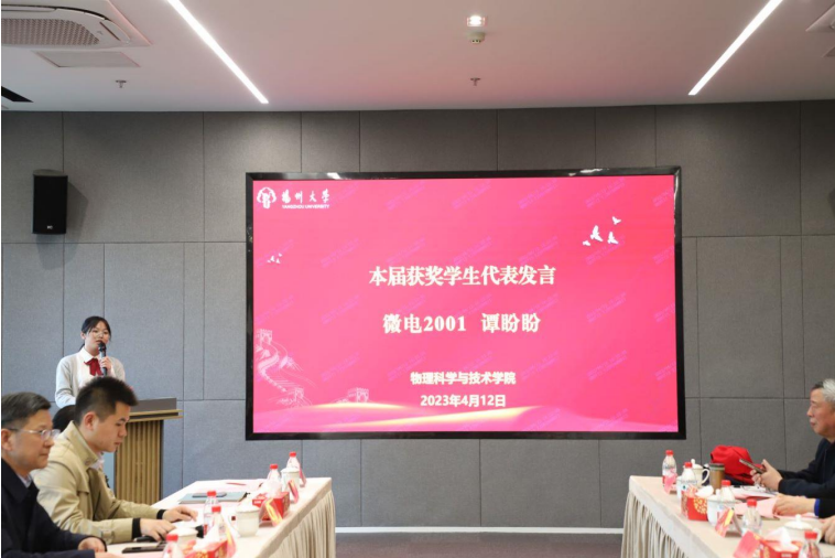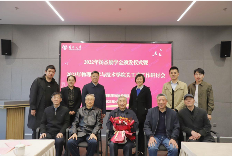 4月12日下午,扬州大学物理科学与技术学院师生走出校门,在扬杰电子科技股份有限公司举行2022年扬杰励学金颁发仪式暨2023年春学期学院关工委工作研讨会。原校党委副书记、原校关工委副主任梁隆圣、校对外联络办公室(校友会、董事会、教育基金会办公室)主任陈克勤、校关工委副主任赵春丹、校关工委顾问刘方云,扬杰电子科技股份有限公司副总裁刘从宁、人资行政中心总监王冬艳、人资行政中心副总监王世豪,院党委书记王春雨、院关工委老师顾长华、石竹南、陈庆琉出席本次会议,历届扬杰励学金获得者代表和有意就职扬杰电子科技股份有限公司的学生代表参加会议。会议由院党委副书记毕瑜林主持。