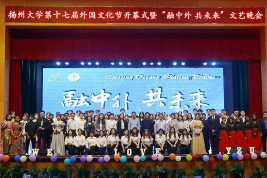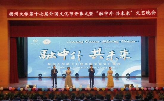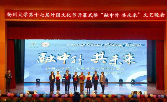 晚7:00,学院在文体馆举办扬州大学第十七届外国文化节开幕式暨“融中外,共未来”文艺晚会。校党委常委、副校长蔡颖蔚,教务处处长严长杰,党委研究生工作部部长吴刚,校团委书记陈佩沛,校关工委副主任赵春丹,海外教育学院党支部书记姚晓群,党委宣传部副部长虞璐,党委学生工作部(学生工作处)副部长(副处长)张平,后勤保障处副处长张小莲,海外教育学院党支部副书记、副院长高敏,外国语学院党委书记居学明,外国语学院副院长(主持工作)何山华出席晚会。
