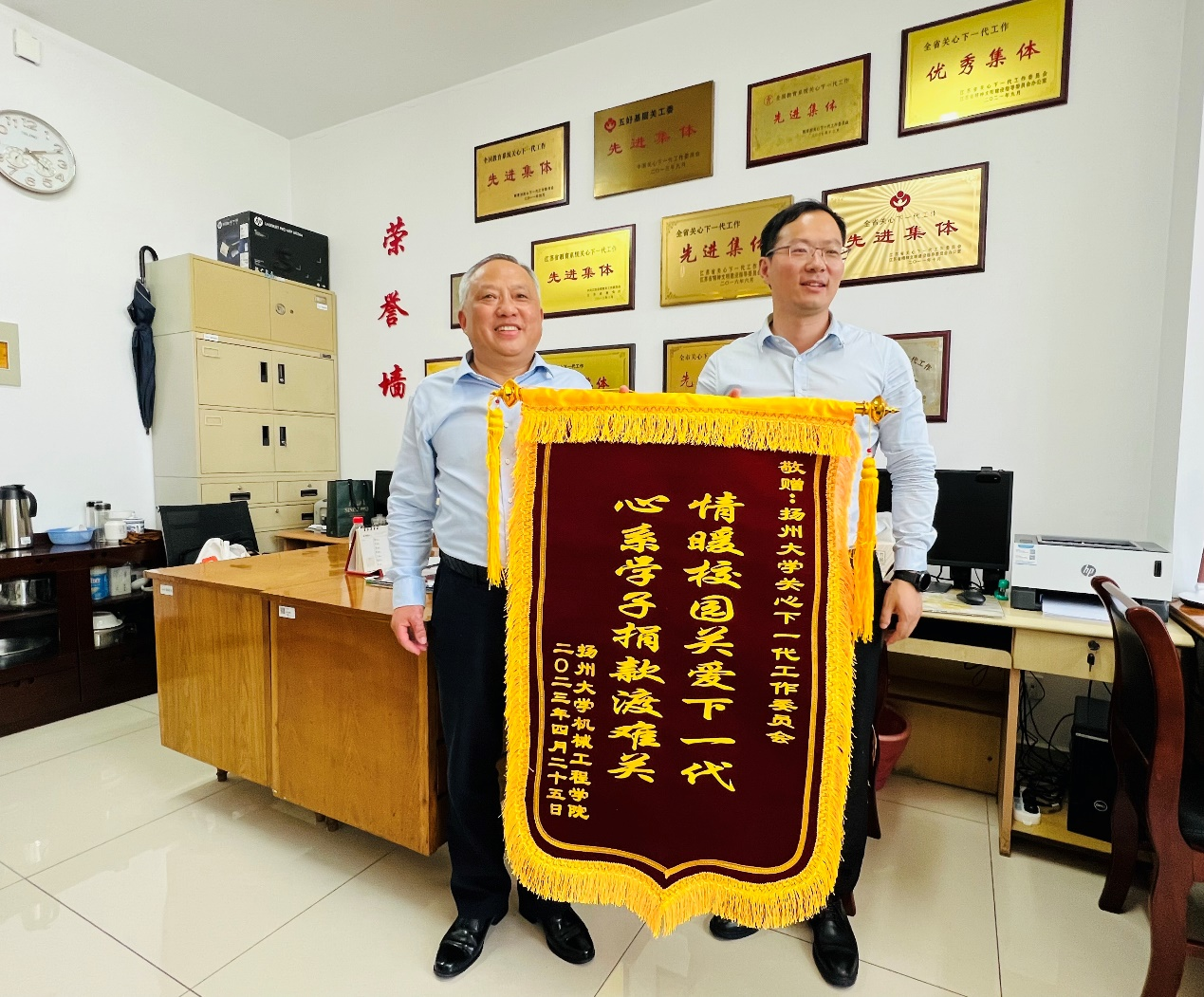 近日,机械工程学院党委副书记毕亮向校关工委赠送锦旗,以表达对校关工委给予的爱心募捐、无私帮助的感激之情。