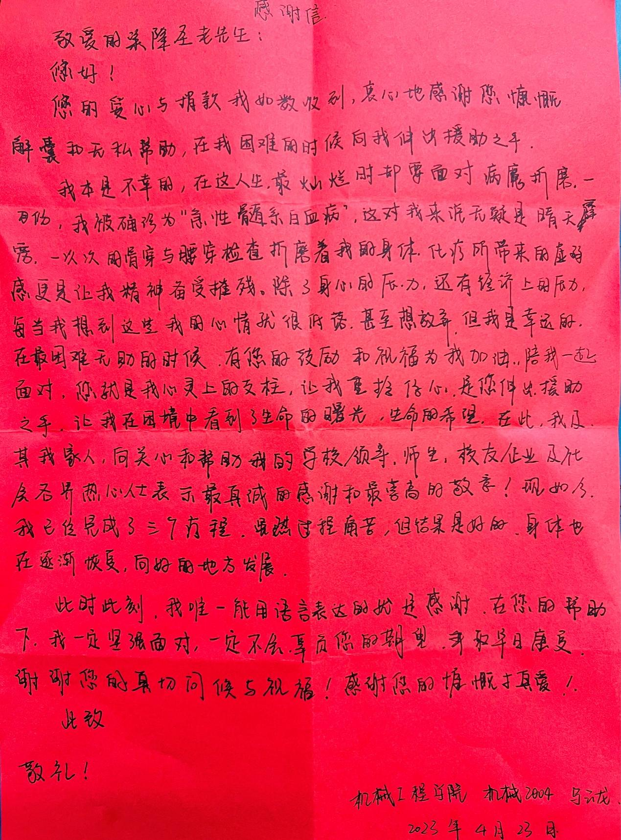 马云龙同学向梁隆圣老书记撰写感谢信