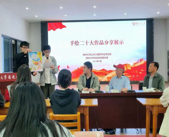 工管2001班的马囡同学向大家展示自己以“党的二十大精神”为主题的手绘作品,满怀激情地说道,“作为新时代青年,我们要肩负起党和祖国人民的重托,以崇高的理想、创新的意识、无畏的勇气发挥青年智慧,乘风破浪,与时俱进!”