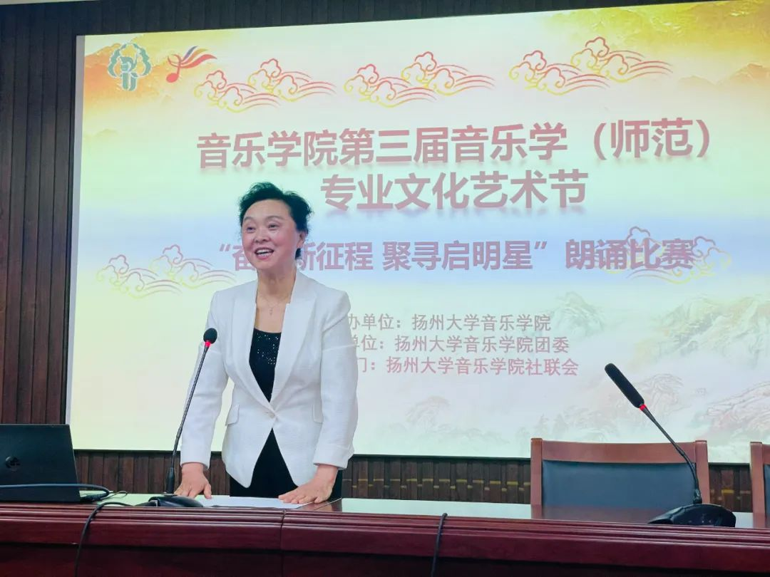 为激发学生的专业学习兴趣,提高学生的综合素质,提高人才的核心竞争力,彰显学生的青春风采与精神面貌,4月20日,我院于美学堂举办音乐学(师范)专业文化艺术节之“奋进新征程 聚寻启明星”师范生朗诵大赛。音乐学院党委副书记吴伟老师、校关工委姚蔚老师、音乐学专业主任张冰冰老师、团委书记(学工办主任)周虹先老师受邀担任本次比赛评委,比赛由音乐表演2101班是晔同学主持。