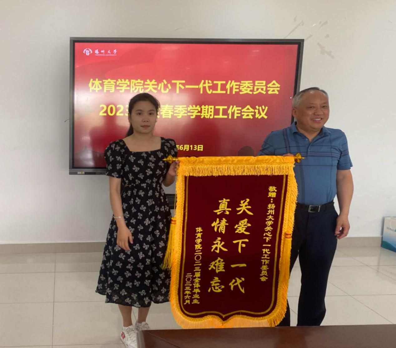 会上,院关工委执行秘书贾明俊宣读了《关于调整体育学院关心下一代工作委员会组成人员的通知》及2023年体育学院关工委“夕阳红工作站”结对名单。院关工委秘书长、院团委书记、学工办主任滕静汇报了学院关工委2023年上半年工作和下半年工作计划。院关工委名誉主任、院党委书记虞强,为老领导、老同志颁发聘书。结对共建班级学生代表作感恩汇报,并代表全体毕业生向校关工委敬赠锦旗,感谢校关工委对他们的关心和指导。