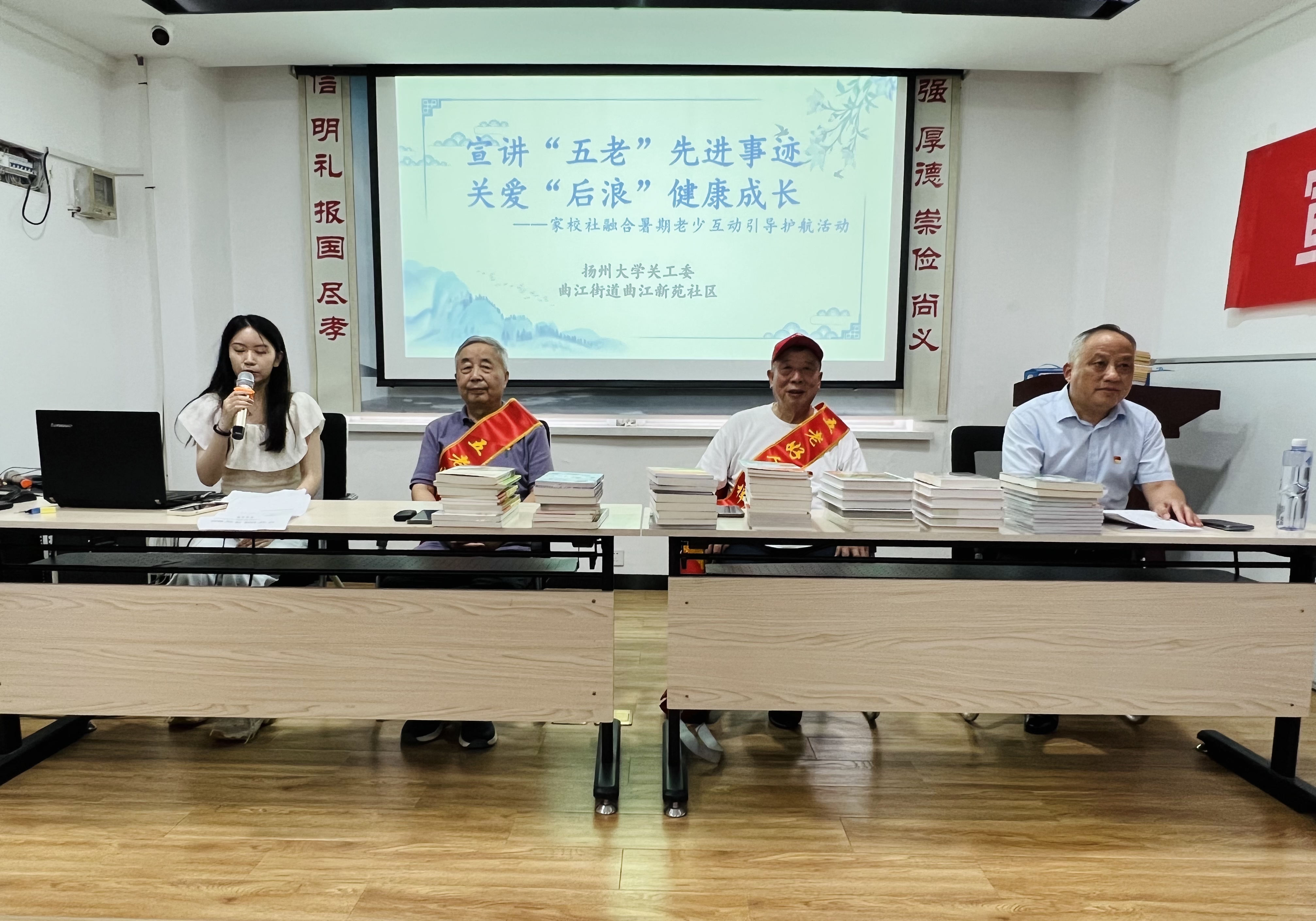 为进一步关爱青少年健康成长,传承红色基因、厚植爱国情怀,充分发挥“五老”优势,7月27日下午,扬州大学关工委联合曲江街道曲江新苑社区开展了“宣讲五老先进事迹 关爱后浪健康成长”——家、校、社融合暑期老少互动引导护航活动。吸引了辖区30余名小学生及家长的参加。