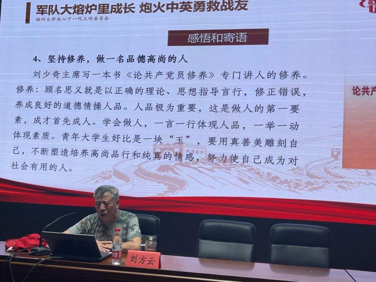 为引导我院学子走近老兵故事,感悟革命精神,厚植爱党爱国情怀,9月6日下午,我院开展“军队大熔炉里成长,炮火中英勇救战友”主题讲座,本次讲座由关工委刘方云老师主讲,全体2023级新生参与。