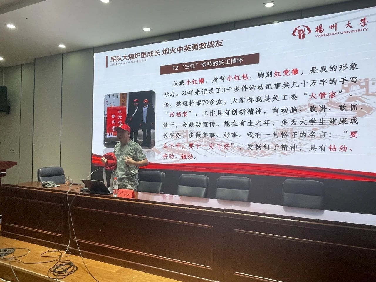 刘方云老师出生于1946年5月,1963年9月参军参加工作,2006年退休,现被学校返聘在扬大关工委办公室工作。刘老师长期从事关心下一代工作,以其对工作的腾腾热爱及在工作中体现出的钉子精神和极端负责的态度,被大家誉为关工委的“老黄牛”;又因为刘老师平易近人、谦逊随和的态度,被大家亲切地称为“小红帽爷爷”。