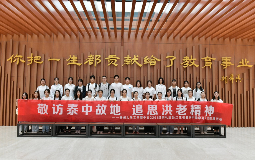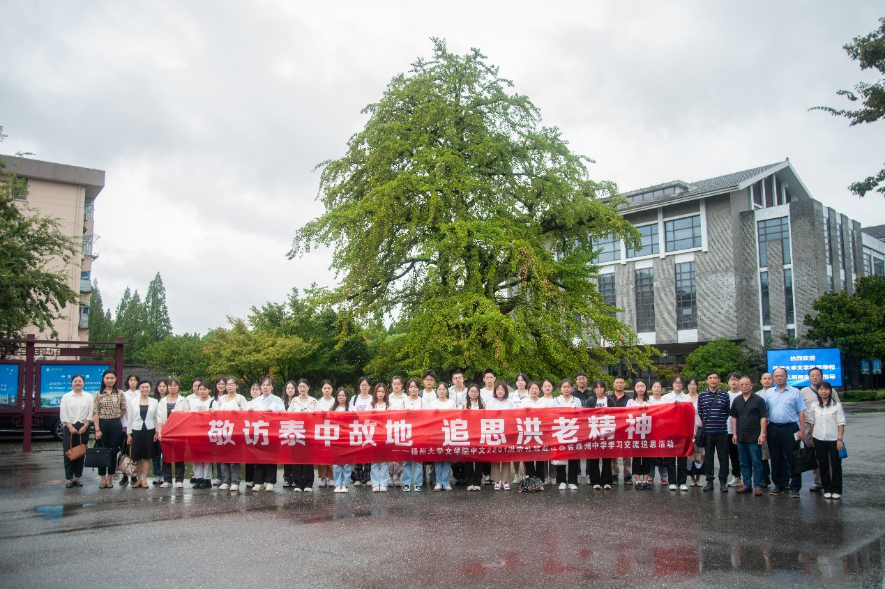9月13日下午,文学院党委书记李怀军、文学院党委副书记张茜,文学院教授、博士生导师徐林祥、文学院学科教学语文教研室龚孟伟、张立兵、韦冬余、孙玉红,瘦西湖校区离退休党总支第一党支部书记姚蔚、文学院关工委委员王乃森,与中文2201洪宗礼班全体师生一行赴江苏省泰州中学开展以“敬访泰中故地 追思洪老精神”为主题的学习交流追思活动。
