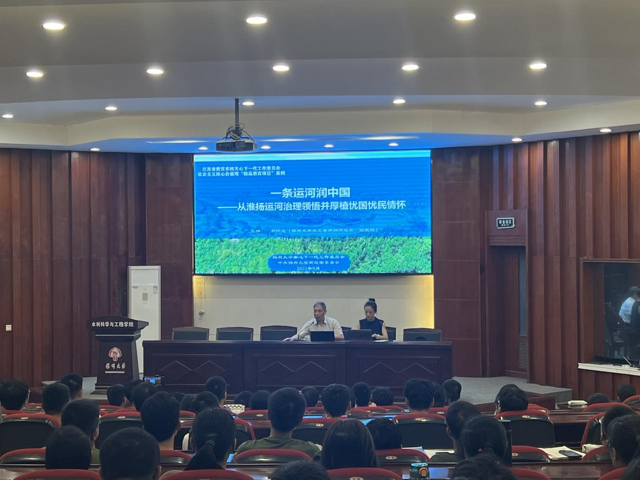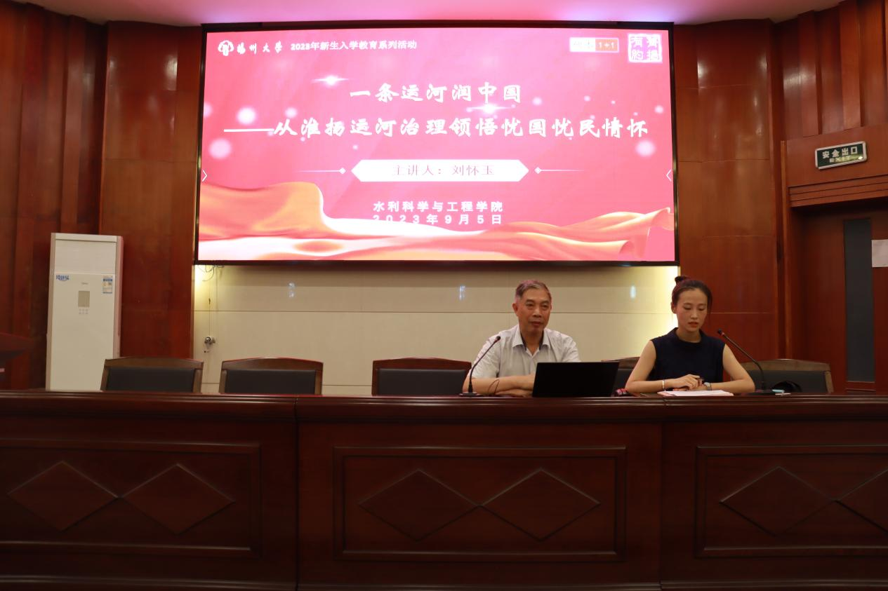 9月5日晚7:00,我院在水利楼报告厅开展2023级新生入学教育,特邀刘怀玉老师做“一条运河润中国——从淮扬运河治理领悟忧国忧民情怀”的讲座,全院400余名本硕新生通过主会场和分会场两种形式参与。讲座由辅导员安文丽主持。
