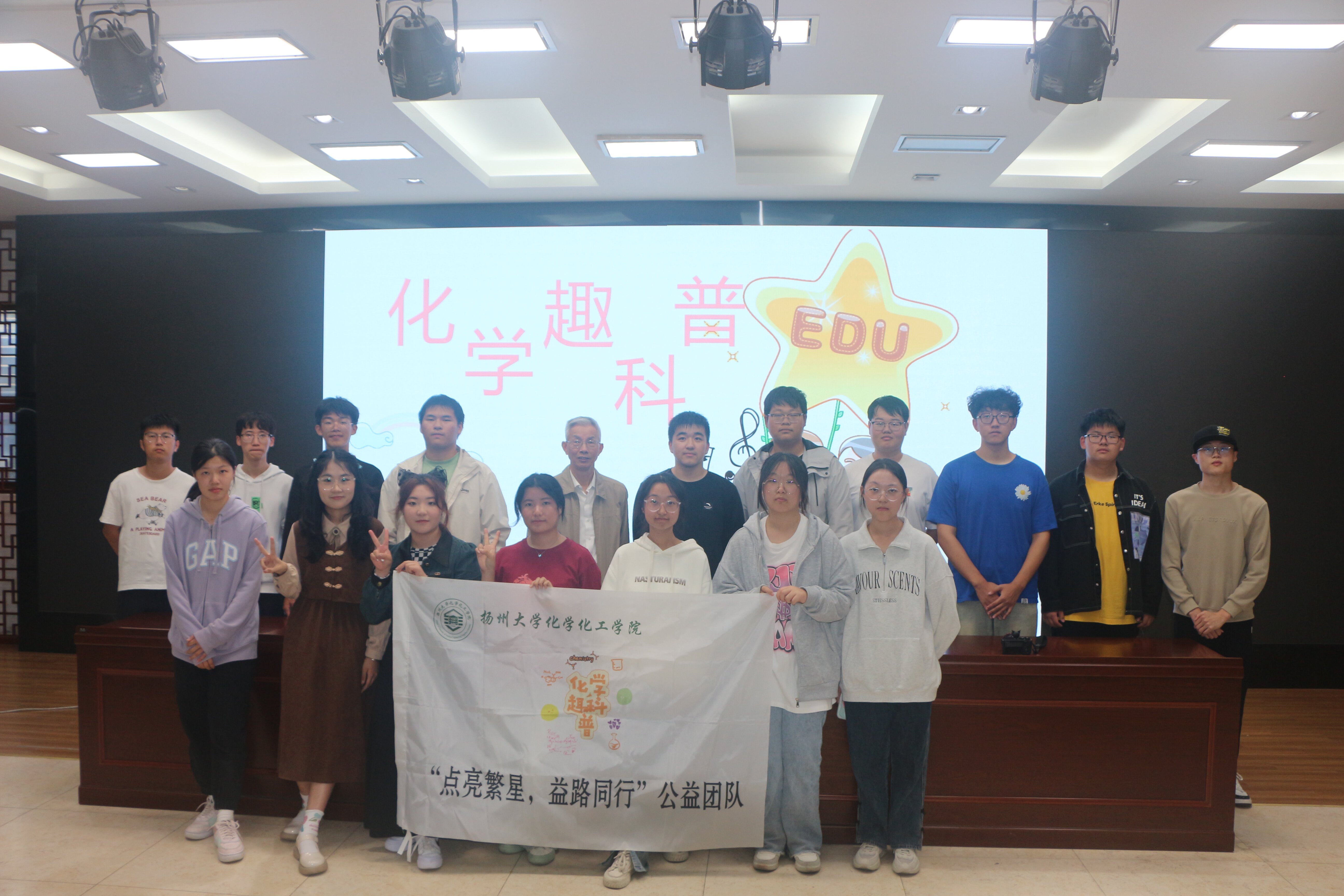 为提升小学生对自然科学的兴趣,感知科学的魅力,激发他们对化学的热爱,10月25日,在扬州大学化学化工学院关工委老同志阚锦晴教授的带领与指导下,扬州大学化学化工学院“点亮繁星,益路同行”公益团队走进扬州市维扬实验小学开展“老少牵手”化学趣科普进校园活动。100余名小学生参与活动。