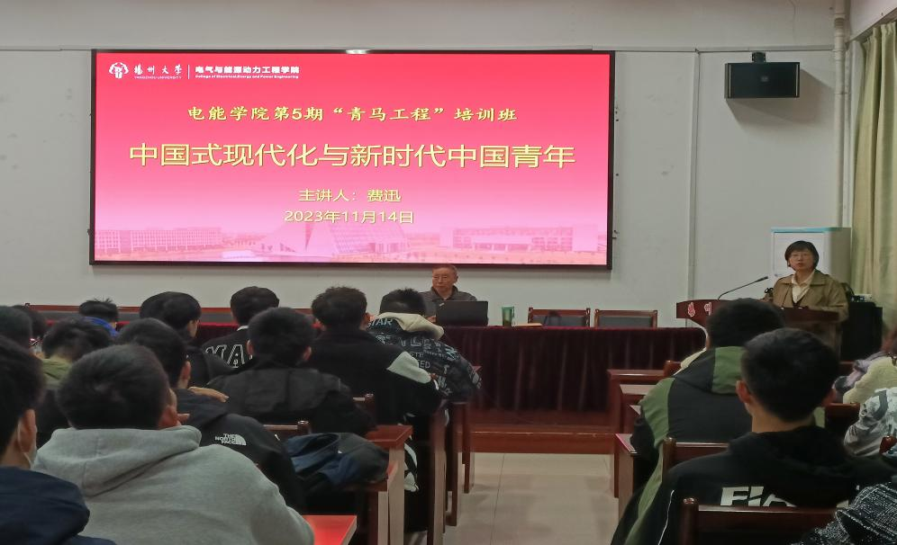 为深入学习贯彻二十大精神,优化促进共青团员身心成长发展,2023年11月14日,扬州大学电气与能源动力工程学院第5期“青马工程”培训班,邀请校关工委费迅教授以“中国式现代化与新时代中国青年”为主题为共青团员们做讲座。