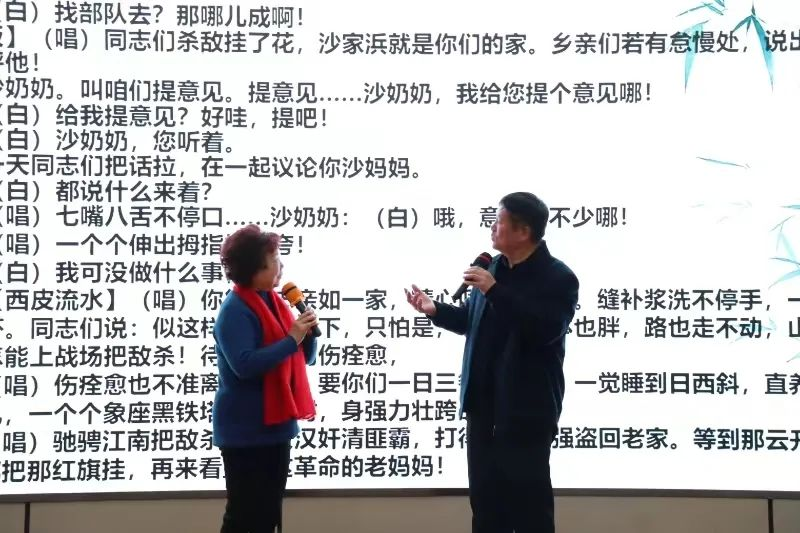 随后,演出正式开始。崔李宇同学带来《霸王别姬》选段,洒泪挥剑,展现一场动人心魄的生死离别;刘圆圆同学所演《梨花颂》选段,梨花带雨,尽诉离人愁思;李开华老师带来的《诗文会》选段,演绎出妙龄少女得见知心画眉郎的欣悦;符学敏老师表演的《锁麟囊》选段则以细腻的笔触,描绘了薛湘灵的苦难命运。黄勤老师的《野猪林》、张武阳老师的《三家店》则分别用月琴与西皮配乐,一扫青衣之婉转,尽现老生之豪迈。在接下来的样板戏《沙家浜》系列中,刘大年老师所唱选段“祖国的好山河寸土不让”,尽显战士之英勇无畏;赵红云和黄勤两位老师的深情对唱,演绎了抗战期间深厚的军民鱼水之情。蒯晓明老师带来的《海港》选段,将再见海港日新月异发展的欣喜表现得淋漓尽致。罗旭宇同学带来的念白表演《群英会》《定军山》选段,展现了扎实的念白基本功和独特的表演风格,而赵红云老师的《打龙袍》更是让同学们享受了一场听觉盛宴。