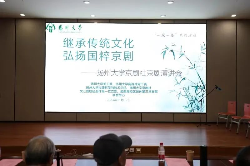 2023年11月12日下午6:30,物理科学与技术学院与扬州大学关工委、扬州大学离退休党工委、扬州大学京剧社、文汇路校区退休第一党支部、瘦西湖校区退休第三党支部在瘦西湖校区S405联合举办了以“继承传统文化,弘扬国粹京剧”为主题的京剧演出。本次演出由扬州大学京剧协会副会长张武阳老师主持。