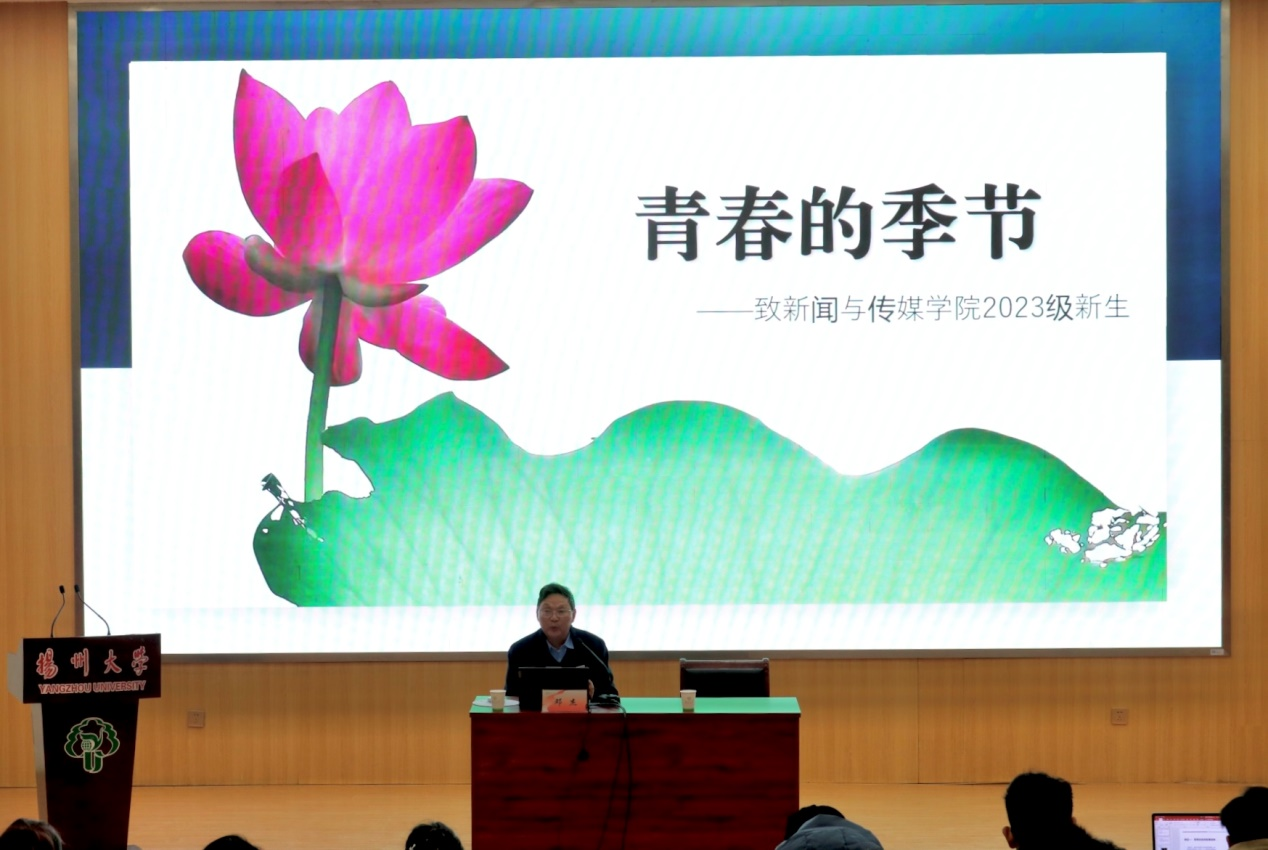 11月25日下午,我院在荷花池校区逸夫图书馆报告厅举行2023级新生入学教育专题讲座。新闻与传媒学院首任院长、校关工委社团顾问组组长邓杰教授应邀作了主题为《青春的季节》专题报告。院党委副书记刘长平主持讲座,2023级全体新生参加讲座。