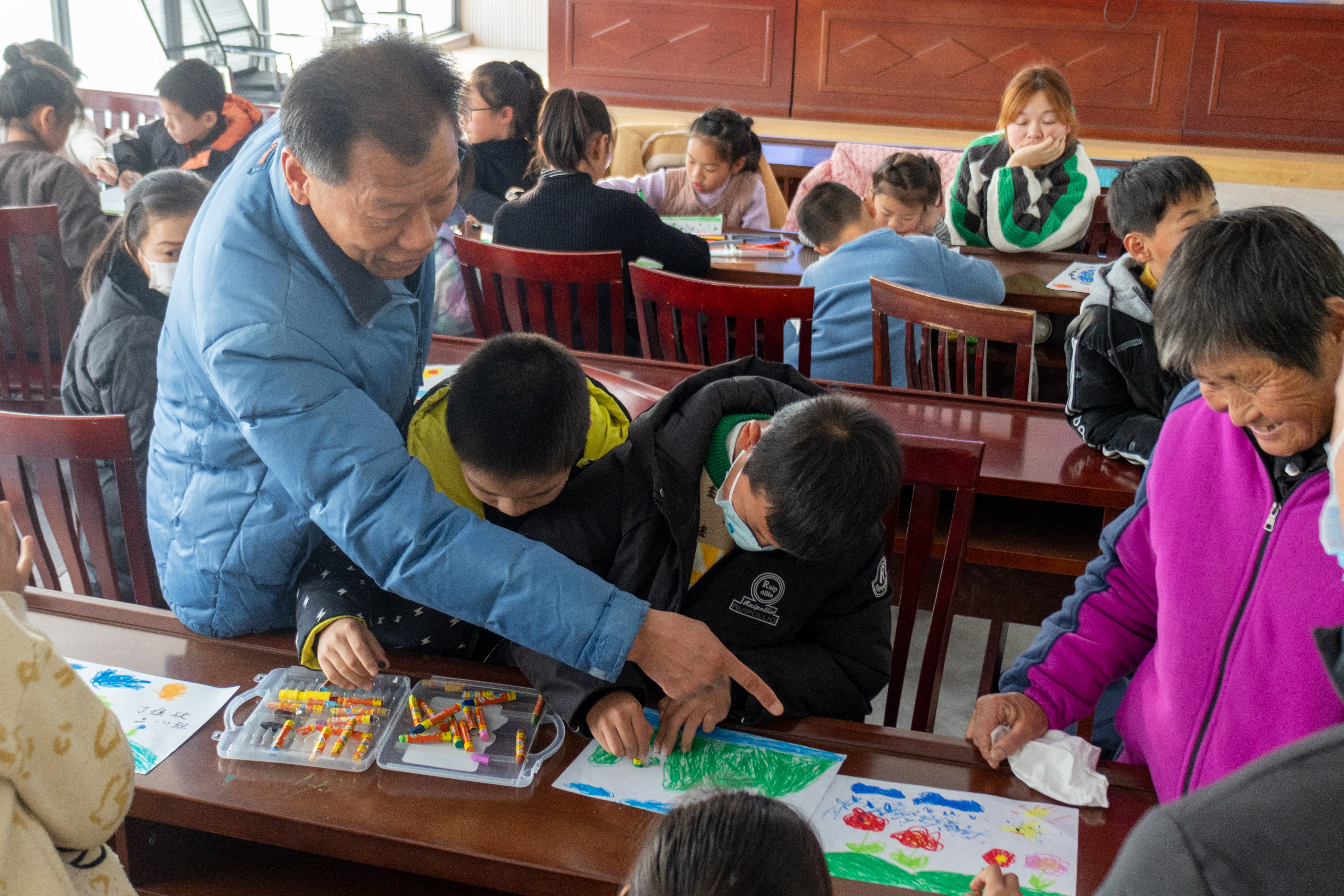 宣讲环节结束后,刘军老师和宣讲团成员们一起带领小朋友用画笔画出自己心中绿水青山的景象。在绘画过程中,小朋友们展开充分想象,努力用画笔创作。刘军老师在指导小朋友们积极创作的同时,也不断给他们送上鼓励,在他们心中种下“保护环境,从小做起”的种子。
