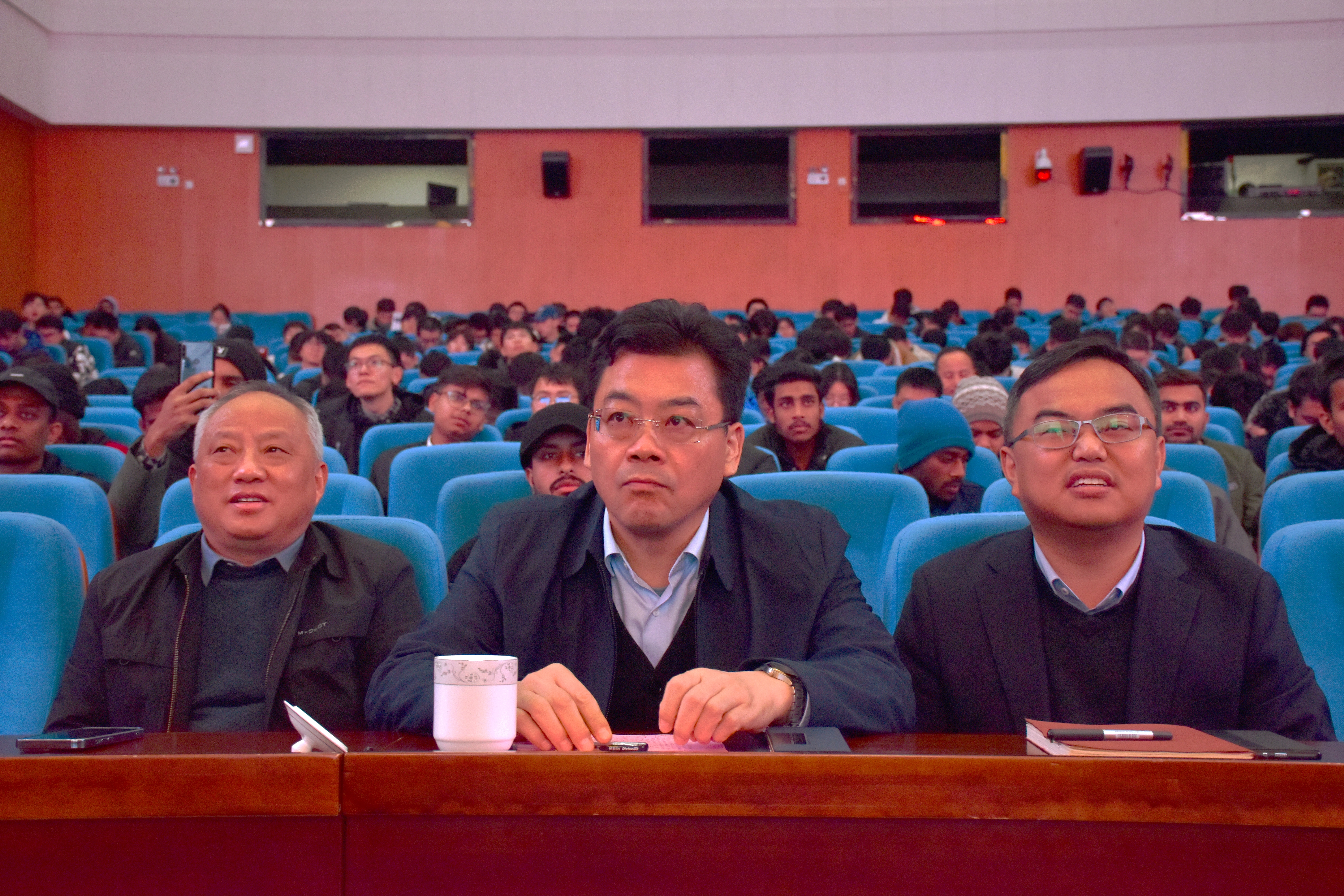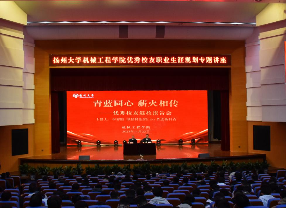 2023年11月22日上午,机械工程学院在文体馆三楼小剧场举办了“青蓝同心 薪火相传——优秀校友返校报告会”。学院邀请亚新科集团CEO首席执行官李开顺校友主讲,校关工委办公室主任(驻会)兼副秘书长、院关工委常务副主任刘汉柏、全体院领导、亚新科集团领导嘉宾出席报告会。学院教师、本科生、研究生及海外留学生 600 余人参加报告会。