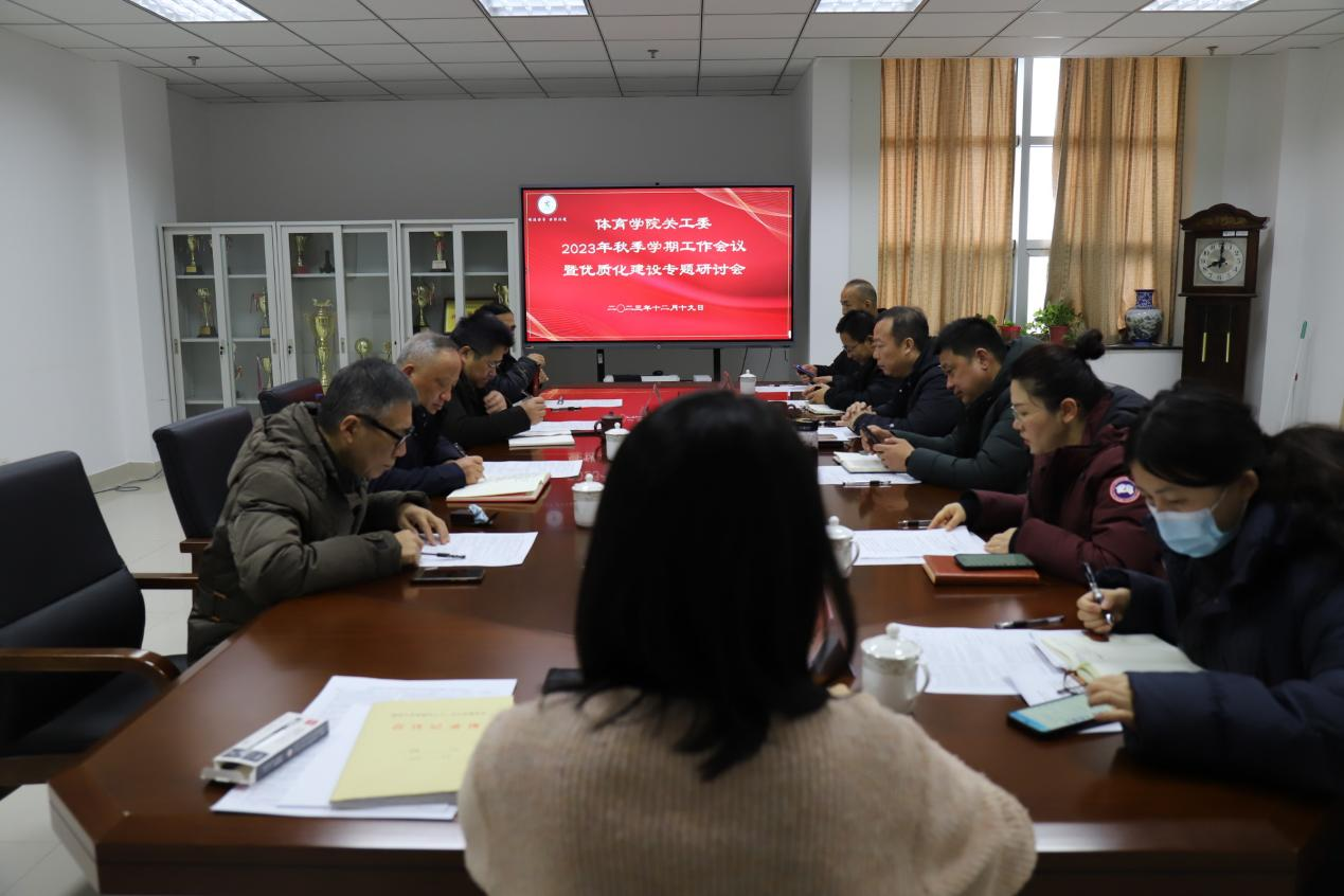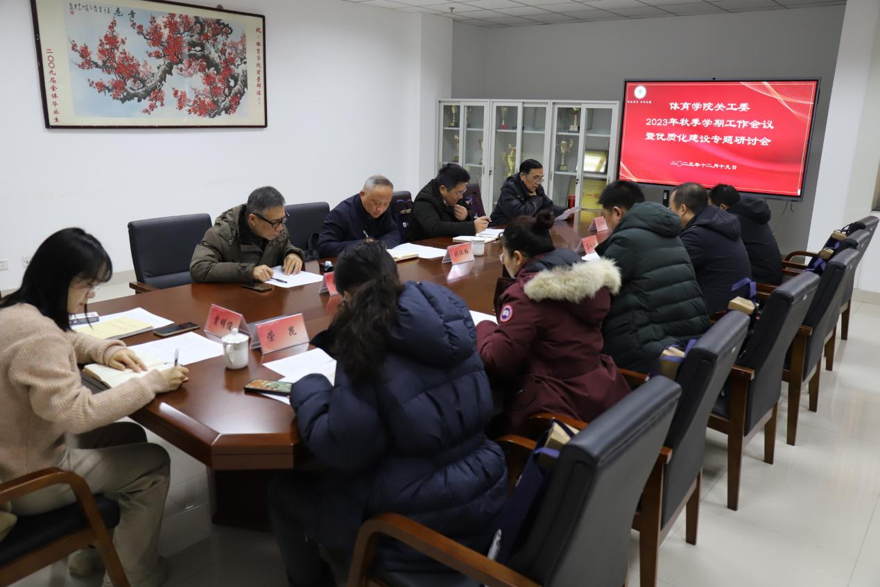 12月19日上午,体育学院在文体馆E503会议室召开了2023年秋季学期关工委工作会议暨优质化建设专题研讨会。校关工委办公室主任、副秘书长刘汉柏,院党委书记、关工委名誉主任虞强,院关工委常务副主任刘煜,院关工委老同志范朝信,院党委副书记、院关工委主任蒋义刚,副院长、院关工委副主任王秋林,以及院关工委全体成员参与本次会议。本次会议由院党委副书记、院关工委主任蒋义刚主持。