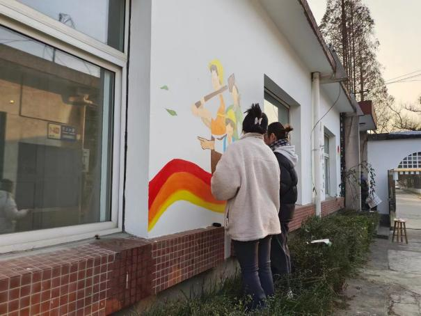本次活动墙绘活动一共分为前期计划、准备、绘画三个部分,同学们在瑟瑟寒风中完成墙面清理、刷底、起稿、弹线、上色等工作,以专业赋能,通过色彩、造型、结构等多种元素来表达创作的主题,将路南之家灰色的墙面变成了文化墙。