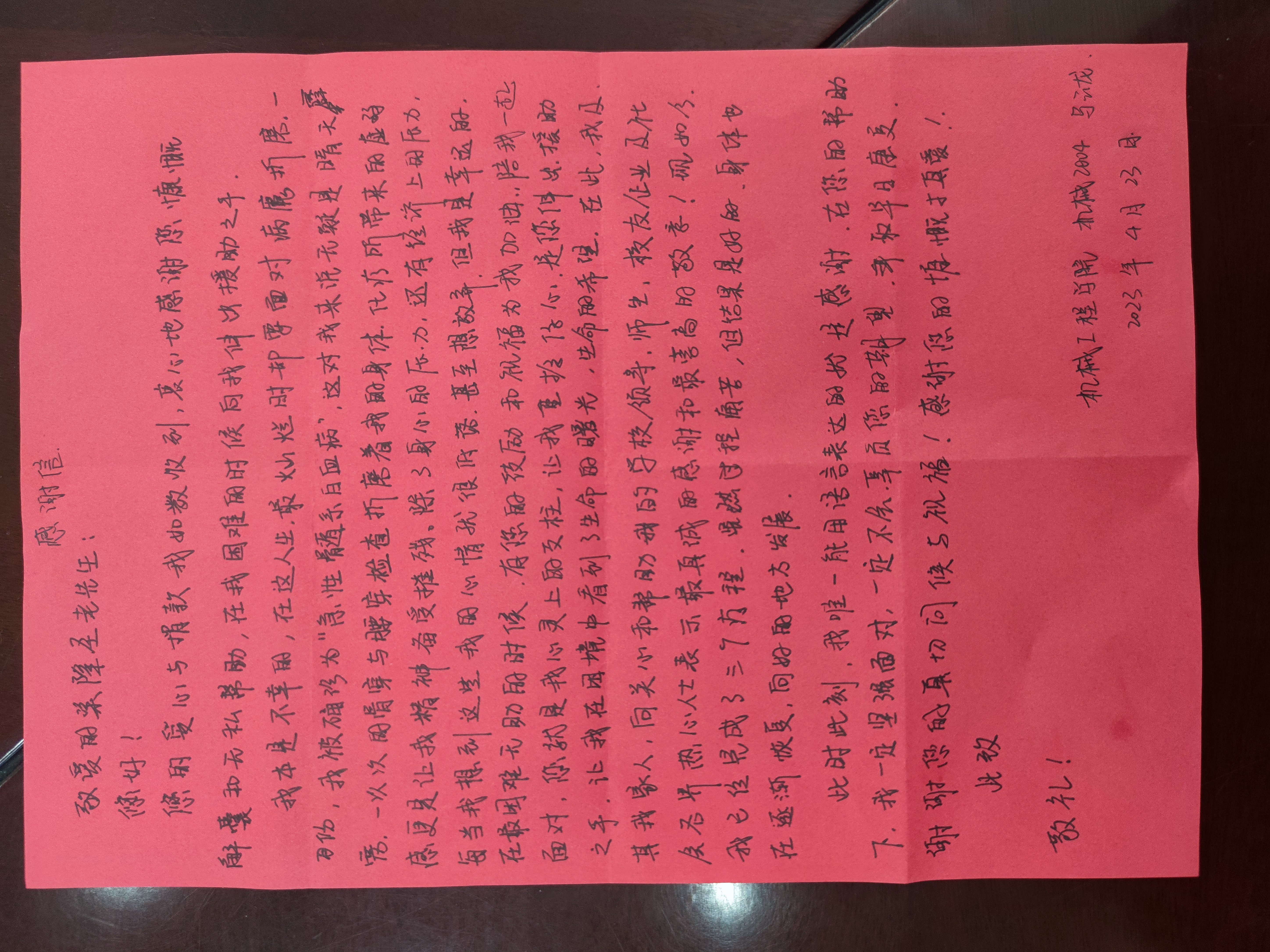 2022年11月,就读于机械工程学院的马云龙被确诊为急性髓系白血病,需要进行骨髓移植,而六十多万的手术费用,对于来自农村的他是个天文数字。了解情况后,学校师生、关工委老同志、校友等各界人士,共为其募集善款超过10万元。整个社会的爱心善举,让马云龙一家重新燃起了“生”的希望。2023年5月,马云龙同学对梁隆圣书记、校关工委送上手写感谢信,表达自己的感恩之情。