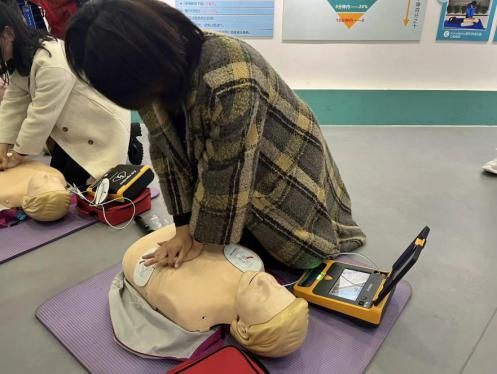 接着,急救志愿者为同学们讲解了全面系统的急救知识。急救志愿者向大家详细介绍了“AED”、气道异物梗阻的排除、心肺复苏现场救护等基础医疗知识,并现场演示了心肺复苏操作技巧及“AED”的正确使用技巧。