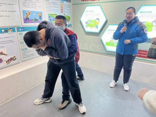 “轻拍重唤,确定意识丧失,判断患者脉搏、呼吸,摆放患者体位,立即行胸外心脏按压30次,进行AED辅助急救……。”急救志愿者利用通俗易懂的语言,结合现场演示教学的方法,为同学们进行“手把手”教学,接着,在急救志愿者的指导下,同学们用仿真人现场演示操作要领,使每个人都真正地掌握遇到紧急情况的操作流程和要点。