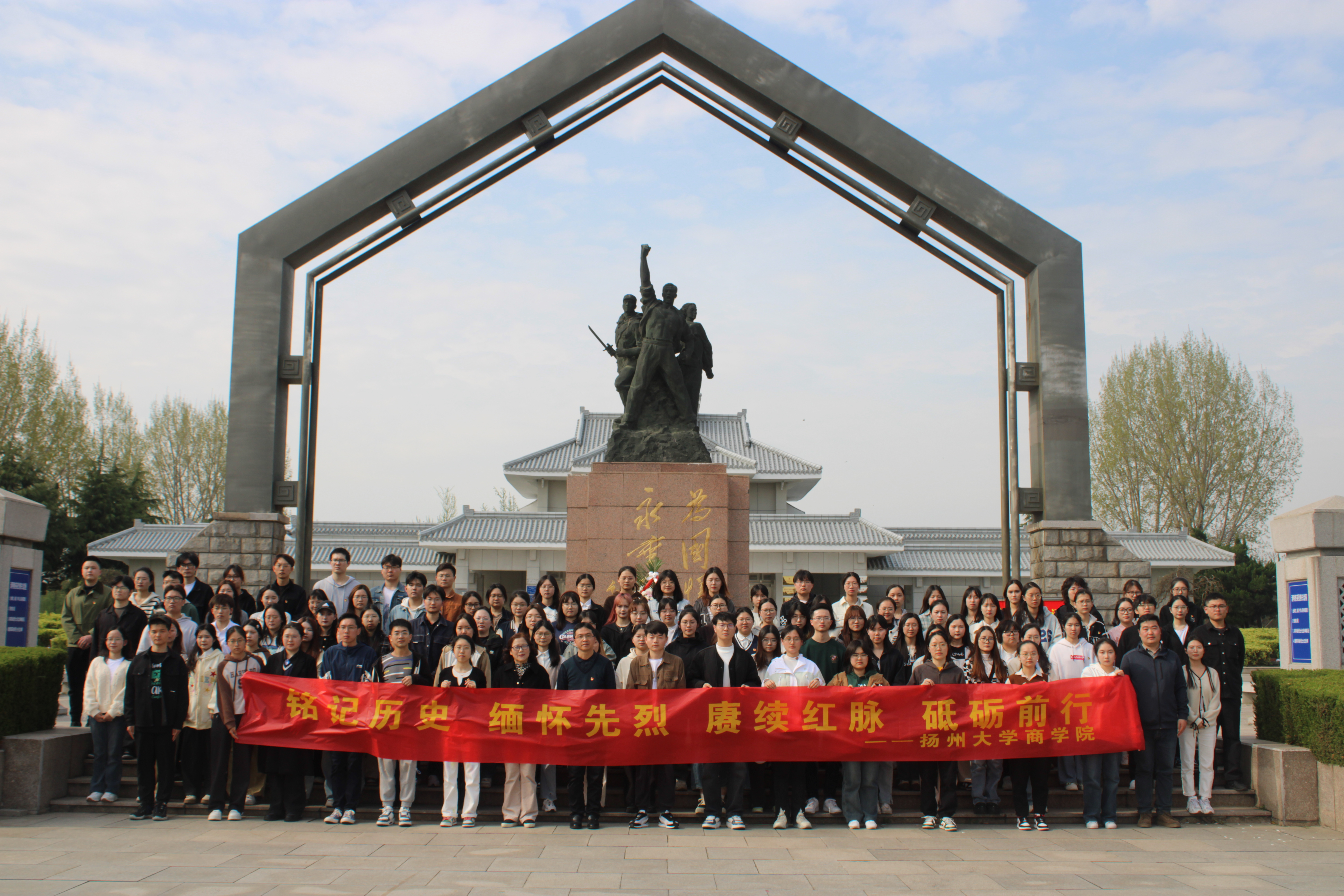 最后,全体师生代表绕碑一周,瞻仰烈士纪念碑并携院旗与党旗拉横幅合影。