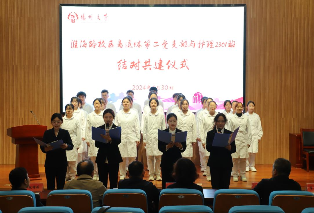 淮海路校区离退休第二党支部书记、院关工委常务副主任季全兰老师提到,今后将根据学生工作的特点,充分调动和发挥已退休人员的工作积极性,有计划地开展利于学生健康成长的活动,注重对学生思想上的关心、情感上的关怀、心理上的疏导。后由淮海路校区离退休第二党支部与护理2301班签订共建协议,共建班级的同学带来诗朗诵《党旗颂》。