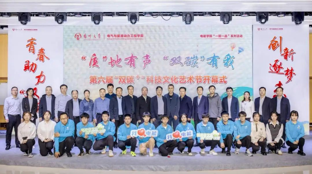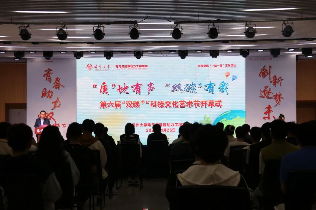 4月26日,电能学院在文体馆智慧就业大厅中庭隆重举办了第六届“双碳+”科技文化艺术节开幕式。活动邀请了扬州市工业和信息化局党组成员、副局长陈江伟,深能南京能源控股有限公司区域总经理曹洪伟,扬州市工信局节能中心主任张立军,扬州市邗江区新盛街道新盛社区党总支副书记陈建霞等特邀嘉宾;扬州大学党委研究生工作部部长吴刚老师,校就业指导中心主任陈轶群老师,校党委组织部副部长王华老师,校党委宣传部副部长刘斯文老师,校党委学生工作部(学生工作处)副部(处)长毛连军老师,校党委保卫部(保卫处)副处长郭兆云老师,校团委副书记王敏老师,校关工委副主任李士庭老师等校内嘉宾;此外,学院党委书记张陟遥老师,院长杨华老师,副院长张继勇老师,学院教师代表、各年级学生代表出席本次活动。